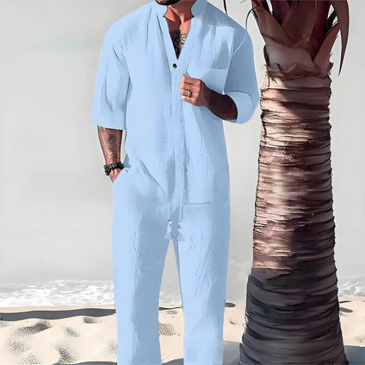 Ensemble Chemise Col Montant & Pantalon Droit en Lin