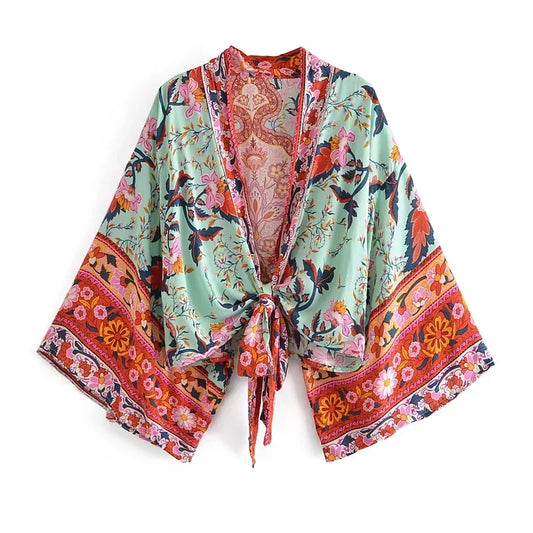 Kimono court femme – Fleur menthe – Léger, fluide et estival