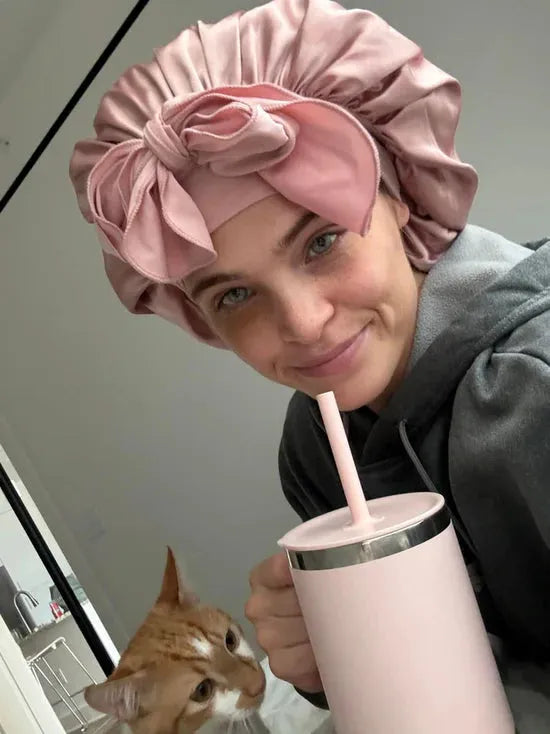 Das integrierte Gummiband passt sich sanft an den Kopf an, ohne auf der Haut zu markieren oder einzuengen. Es ist leicht und atmungsaktiv, passt sich jedem Haar an - ob lockig, glatt oder kraus - und bleibt die ganze Nacht über fest an seinem Platz, selbst bei unruhigen Schläferinnen.