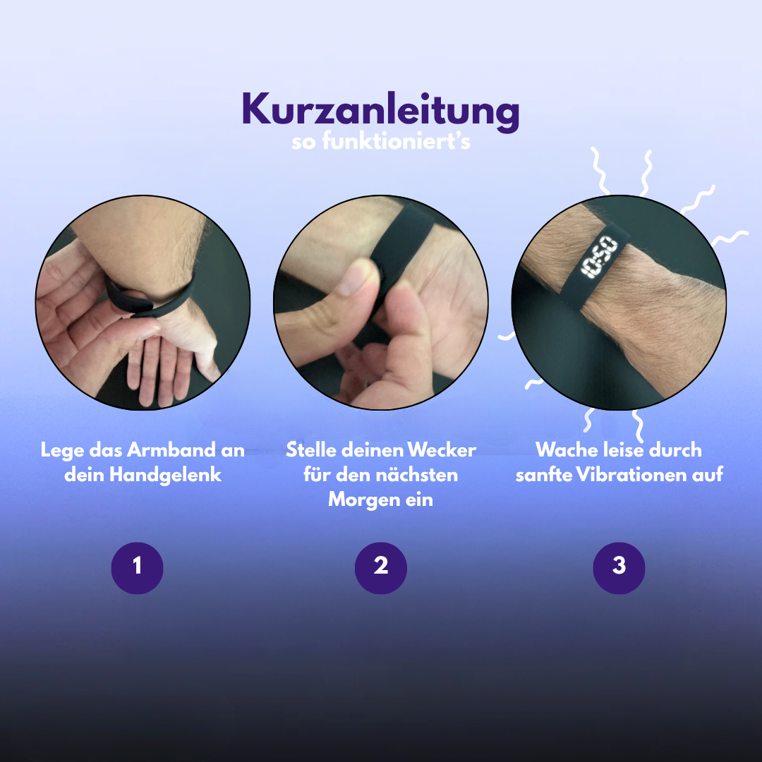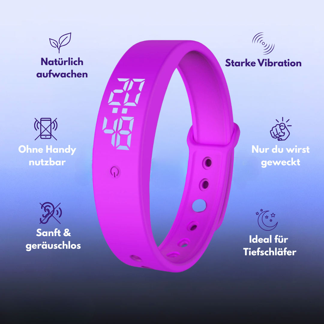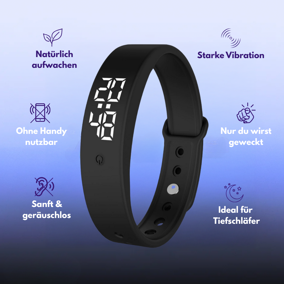 Dieses vibrierende Armband ist eine effektive Alternative zu herkömmlichen Weckern mit akustischem Alarm. Dank seiner progressiven Vibrationen weckt es sanft, ohne Lärm und Stress. Das Armband lässt sich nachts bequem am Handgelenk tragen und ermöglicht ein gezieltes Aufwachen, ohne die Mitmenschen zu stören. Sein gut lesbares Digitaldisplay erleichtert das Ablesen der Uhrzeit, selbst bei Tagesanbruch.