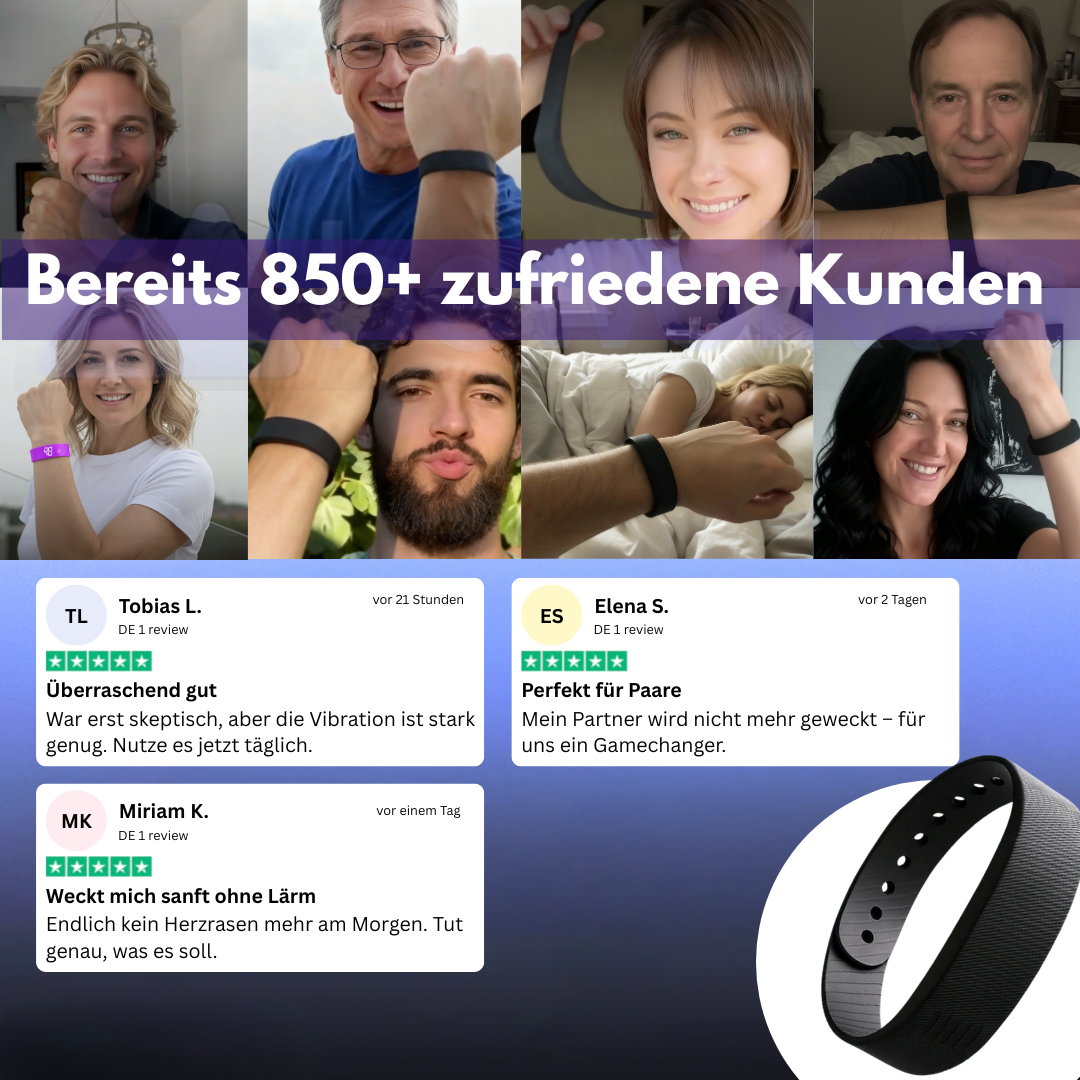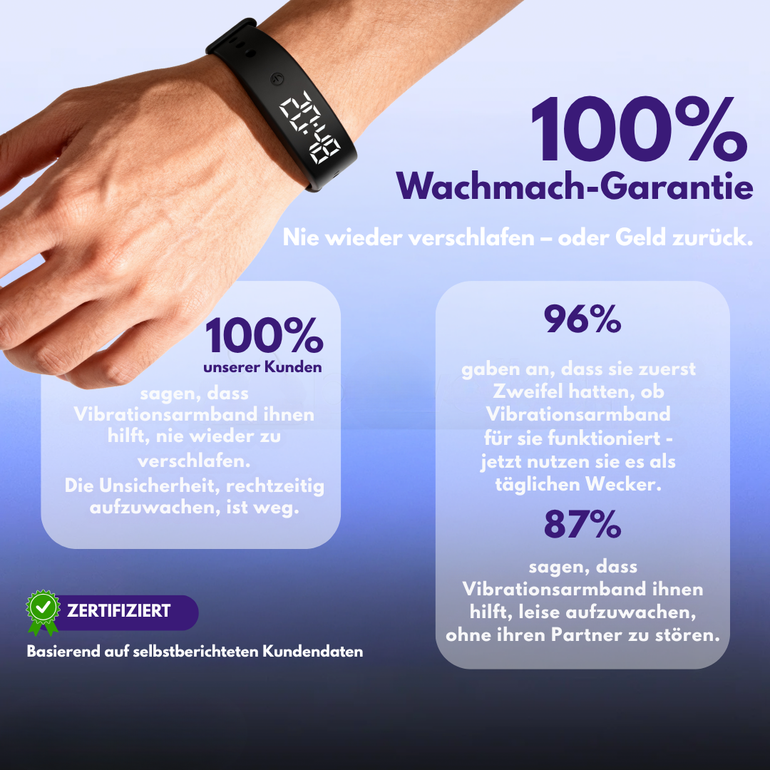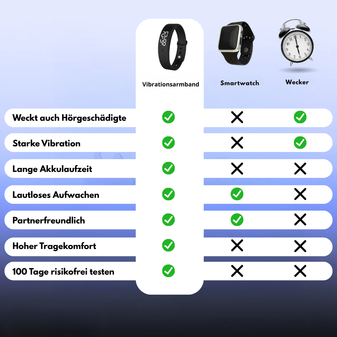 Dieses vibrierende Armband ist eine effektive Alternative zu herkömmlichen Weckern mit akustischem Alarm. Dank seiner progressiven Vibrationen weckt es sanft, ohne Lärm und Stress. Das Armband lässt sich nachts bequem am Handgelenk tragen und ermöglicht ein gezieltes Aufwachen, ohne die Mitmenschen zu stören. Sein gut lesbares Digitaldisplay erleichtert das Ablesen der Uhrzeit, selbst bei Tagesanbruch.