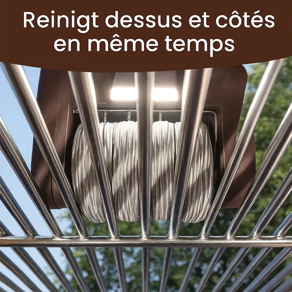 Mit ihrem rotierenden Kopf aus Edelstahl entfernt diese Bürste effektiv verkrustete Rückstände, ohne den Rost zu beschädigen. Sie arbeitet ohne Borsten, wodurch die Gefahr von Metallfäden in den Lebensmitteln vermieden wird. Die Rotationsgeschwindigkeit von 350 U/min ermöglicht es, auch schwer zugängliche Bereiche zu entfetten, ohne Druck auszuüben.