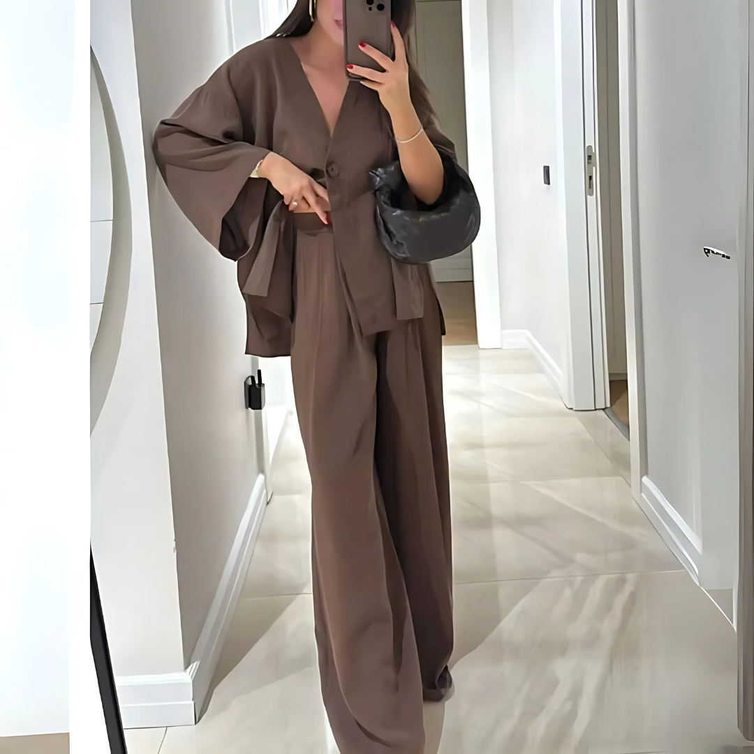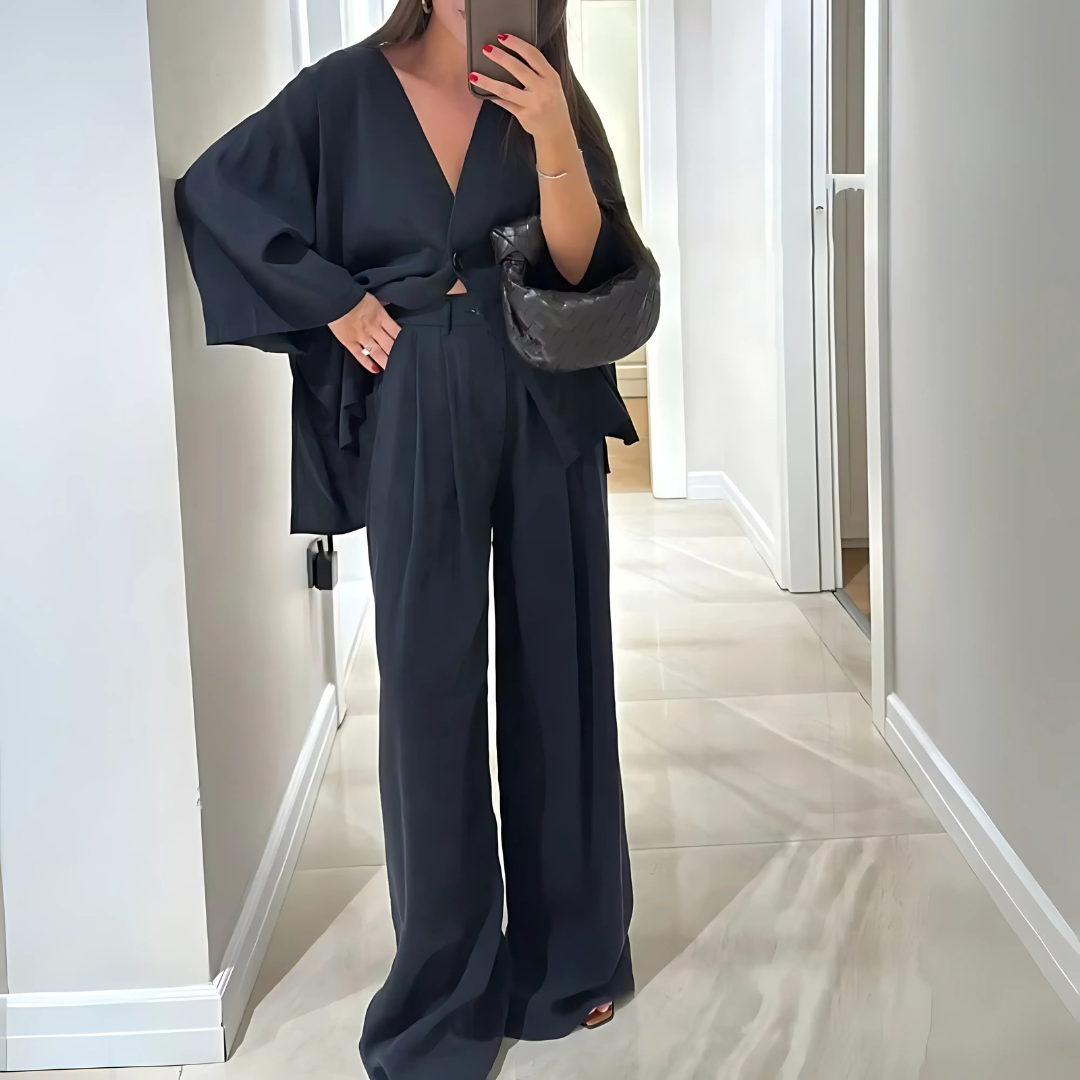 Dieses stilvolle Casual V-Neck Set kombiniert lässiges Design mit einem Hauch von Raffinesse. Der weite Schnitt sorgt für optimale Bewegungsfreiheit und setzt gleichzeitig modische Akzente. Der tiefe V-Ausschnitt schmeichelt der Silhouette und verleiht dem Outfit eine moderne Note.