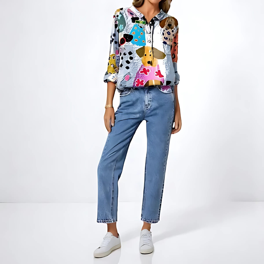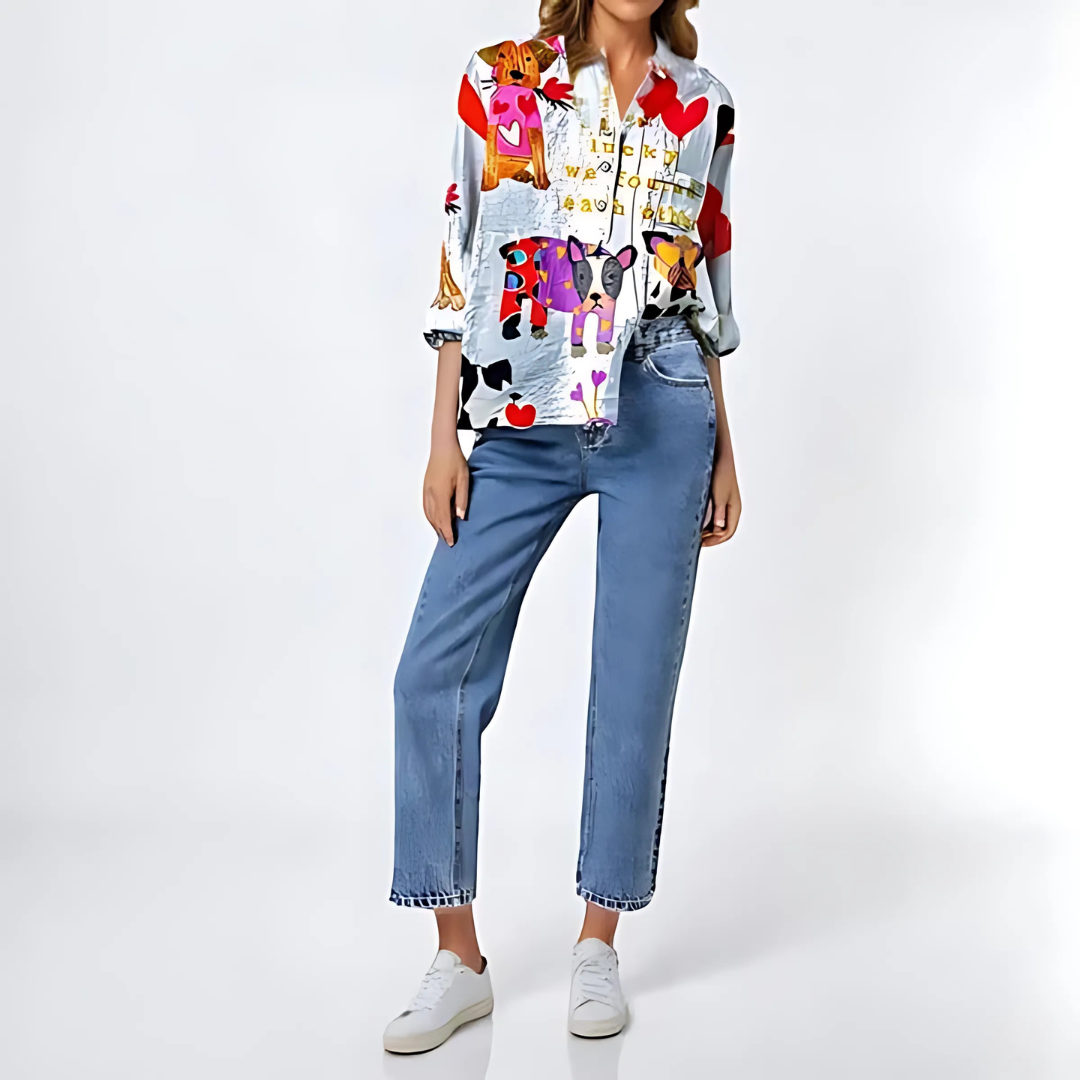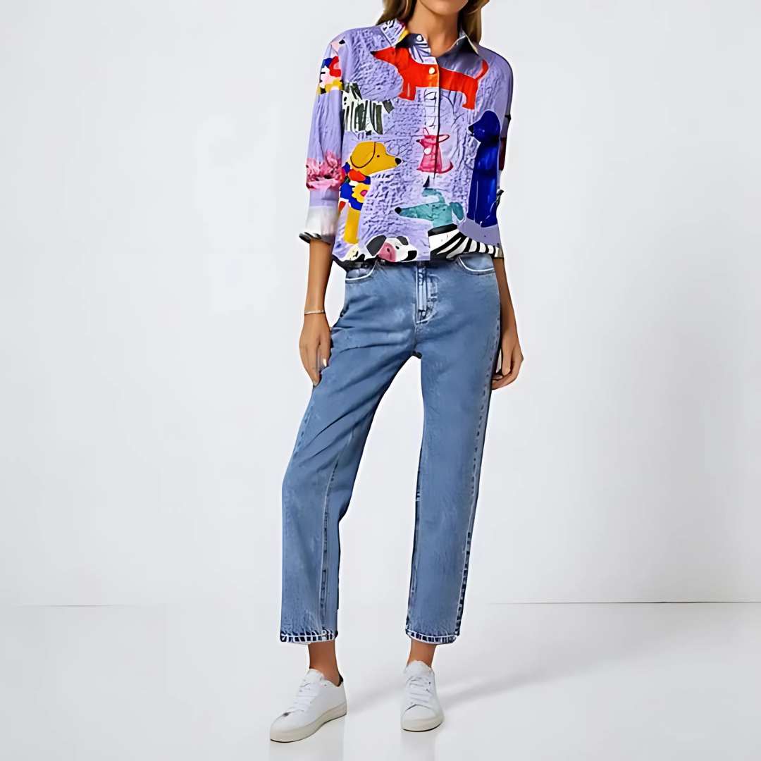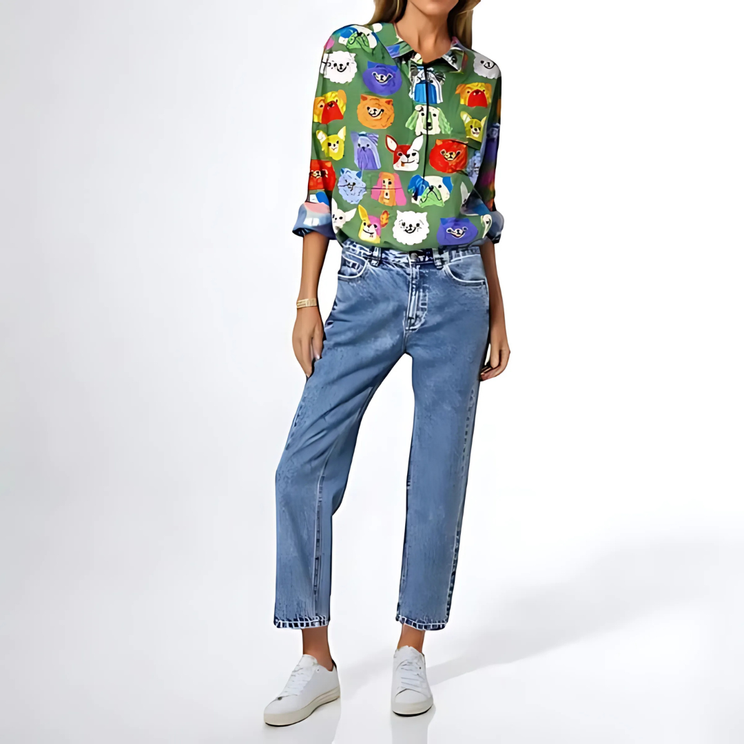 Verleihen Sie Ihren Outfits eine fröhliche und elegante Note mit diesem Damenhemd mit Hundeprint. Der gerade Schnitt und der leichte Stoff sorgen für eine moderne Silhouette, die perfekt ist, um Ihre Looks zu dynamisieren. Der verspielte, feine Druck macht jedes Stück zu einem einzigartigen Kleidungsstück, das auf subtile Weise die Blicke auf sich zieht.