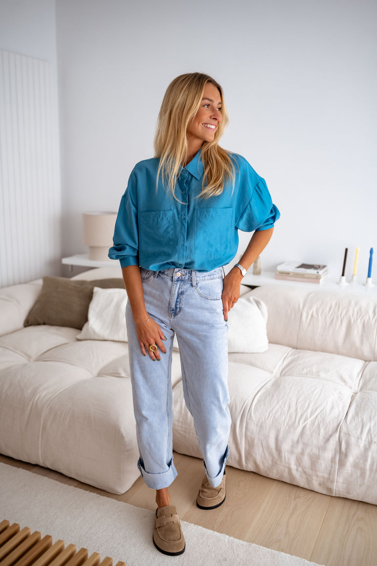 Das Taiba-Hemd zeichnet sich durch seinen lockeren, fließenden Schnitt aus, der sich jeder Körperform anpasst. Die vibrierende blaue Farbe verleiht Ihrem Outfit einen frischen Touch und ist perfekt für einen legeren Tag oder einen eleganten Abend.