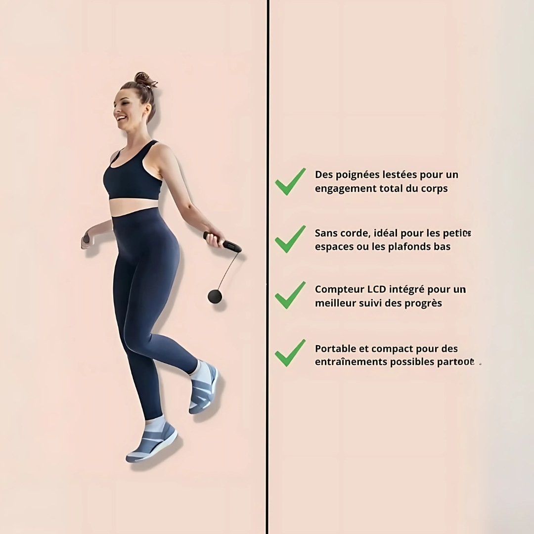 Dank des kabellosen Mechanismus passt sich dieses Seil jedem Raum an, ohne dass es sich verfangen oder Lärm verursachen kann. Das Gerät ist leicht und ergonomisch und passt problemlos in eine Sporttasche oder eine Schublade, sodass Sie es überall hin mitnehmen können.