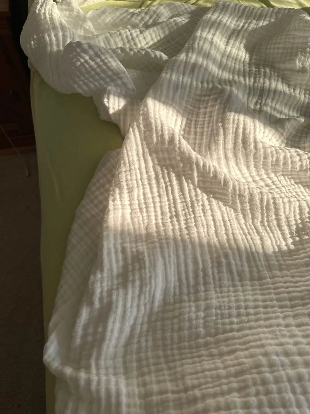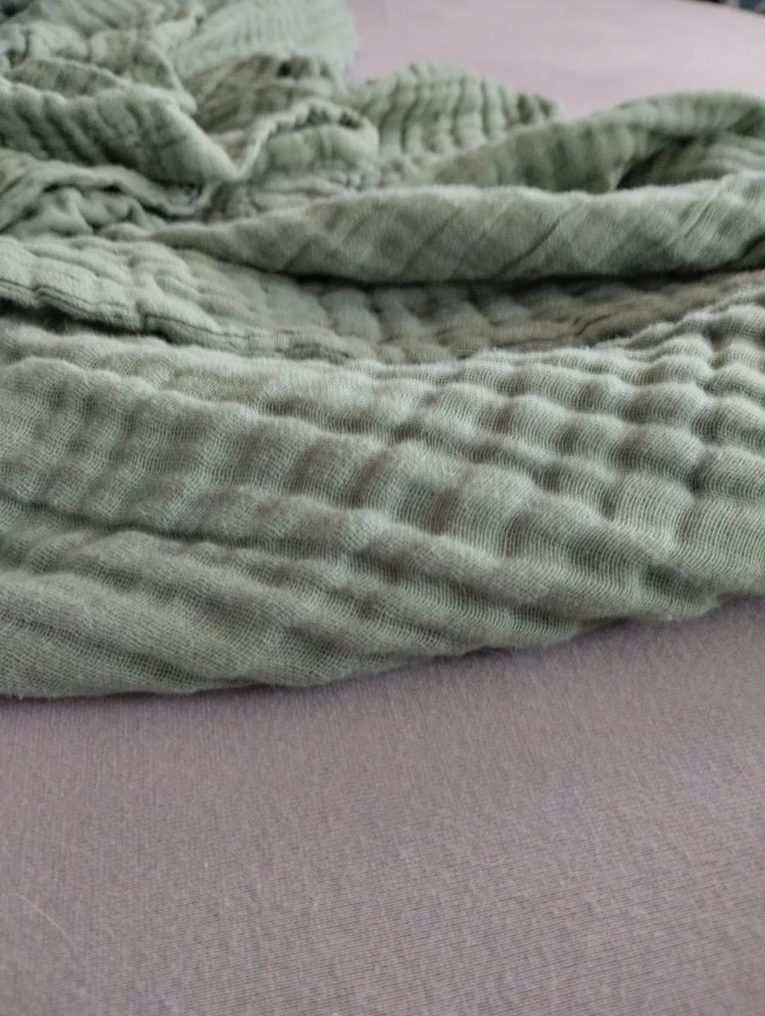 Der verwendete Baumwollmusselin fühlt sich weich an und ist hypoallergen. Es ist ideal für empfindliche Haut geeignet und behält auch nach mehrmaligem Waschen seine Geschmeidigkeit. Es ist pflegeleicht, trocknet schnell und behält sein ursprüngliches Aussehen, ohne sich zu verziehen.