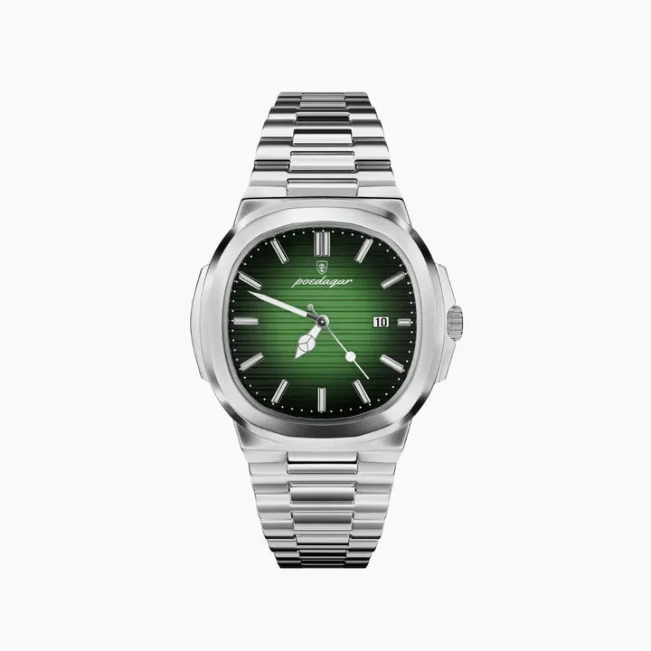 Die "Poedagar 41mm" ist mehr als nur eine Uhr - sie ist ein Ausdruck von Charakter. Mit ihrem markanten Zifferblatt in Tiefgrün und dem gebürsteten Edelstahlarmband verbindet sie modernes Design mit klassischer Eleganz. Jedes Detail wurde durchdacht: Vom schlanken Gehäuse bis zur präzisen Zeitanzeige - sie passt sich Ihrem Alltag perfekt an.
