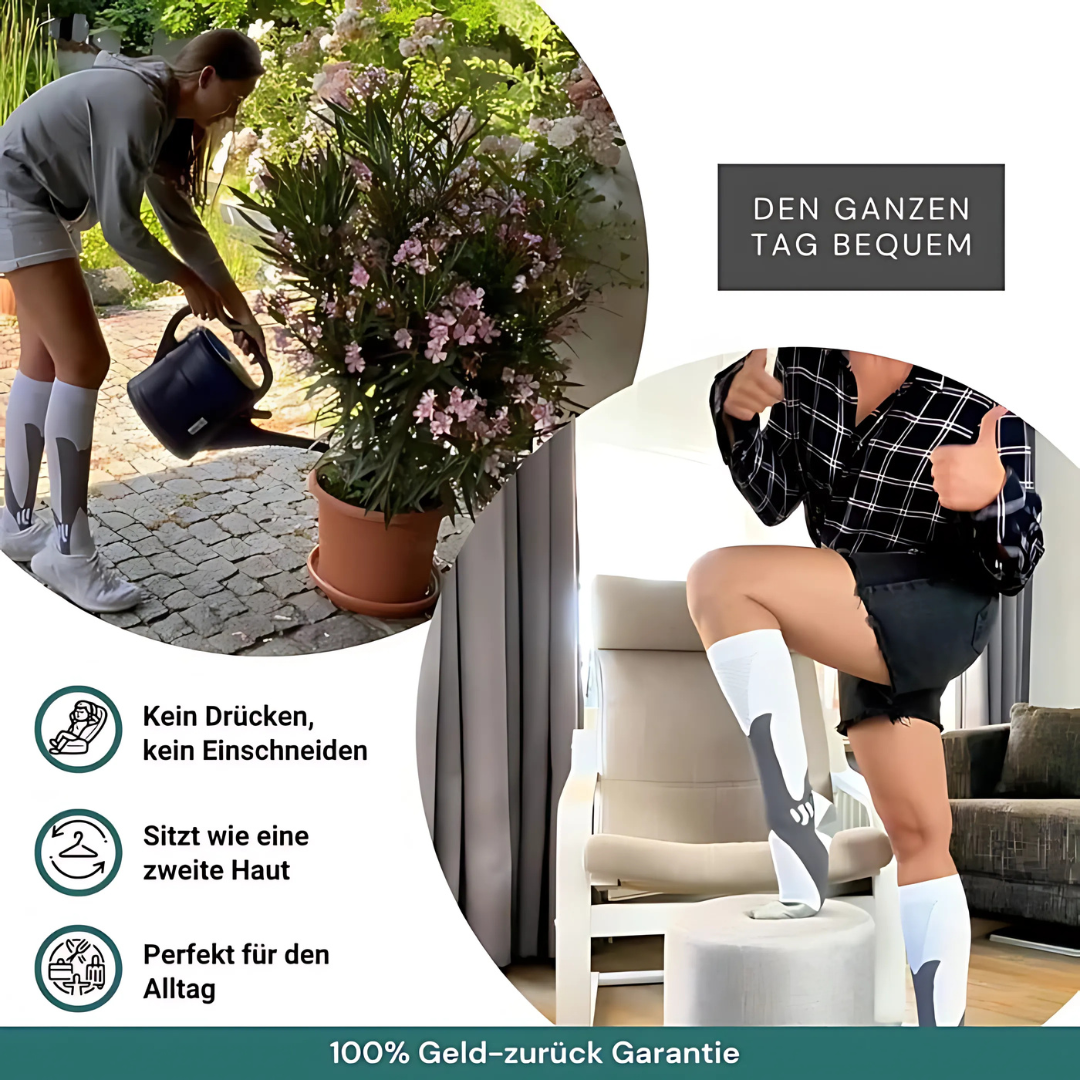Diese Kompressionssocken wurden entwickelt, um die Durchblutung zu fördern und Müdigkeit spürbar zu reduzieren. Ideal für langes Stehen, Reisen oder Sport - Ihre Beine fühlen sich sofort leichter an.