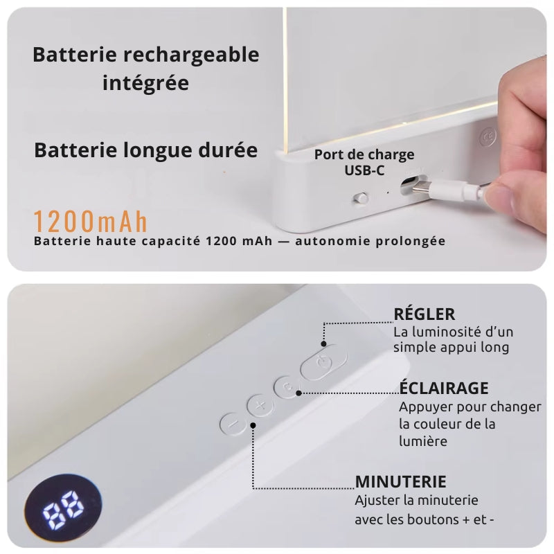 Das ausgestrahlte Licht ist sanft und stabil. Es schont die Augen und verringert die Ermüdung der Augen bei langen Lesesitzungen. Auf einem Buch, einem Tablet oder einer Zeitschrift angebracht, begleitet es jeden Moment der Ruhe, ohne die Menschen in der Umgebung zu stören.