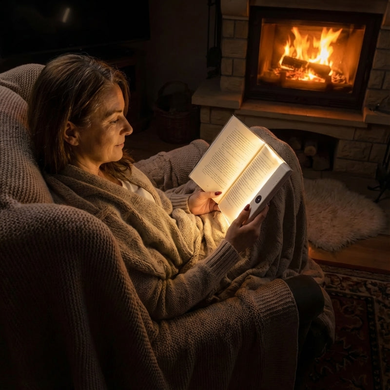 Um unter guten Bedingungen lesen zu können, braucht man eine geeignete Beleuchtung. Diese Leselampe mit Leuchtfeld strahlt ein gleichmäßiges Licht direkt auf die Seite, ohne Schatten oder Blendung. Der Text bleibt auch in einer dunklen Umgebung gut lesbar, während eine beruhigende Atmosphäre erhalten bleibt.