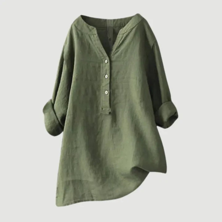 Dieses luftige Leinenhemd sorgt für ein angenehmes Hautgefühl - selbst an warmen Tagen. Der V-Ausschnitt mit Knopfleiste verbindet Eleganz und Alltagstauglichkeit. Der lockere Schnitt fällt weich über die Hüften und sorgt für eine schmeichelhafte Silhouette.
