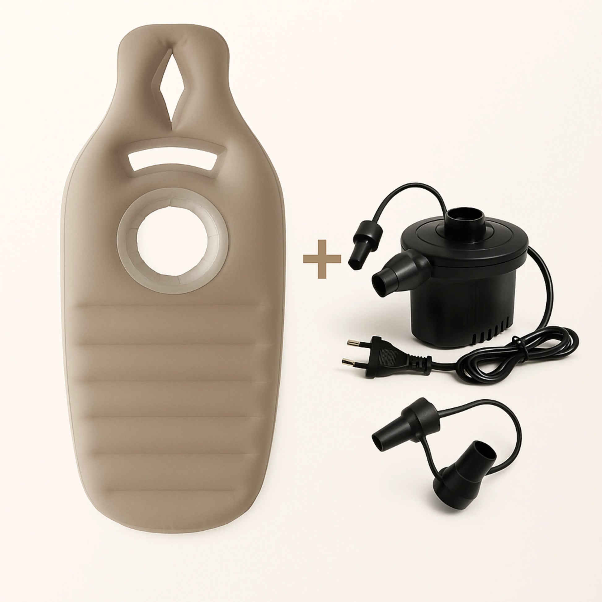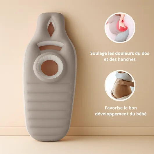 Er besteht aus einem weichen, strapazierfähigen Material, lässt sich leicht aufblasen und passt sich jeder Körperform an. Ideal ab dem zweiten Trimester, begleitet er die Schwangerschaft bis zur Geburt und kann sogar als Stütze beim Stillen oder zur Erholung nach der Geburt dienen.