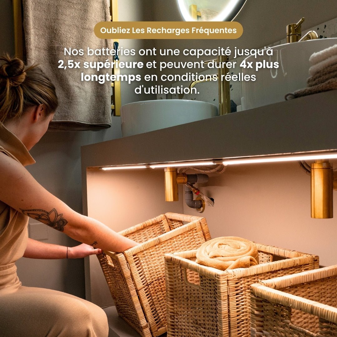 Ausgestattet mit einem Akku mit hoher Kapazität garantiert die Leiste Mouvement 3.0™ wochenlangen Lichtbetrieb ohne Aufladen. Ihr Energiesparmodus und ihre leistungsstarken LEDs bieten eine ideale Leuchtkraft ohne übermäßigen Verbrauch. Beleuchten Sie intelligent und optimieren Sie Ihren Komfort im Alltag.
