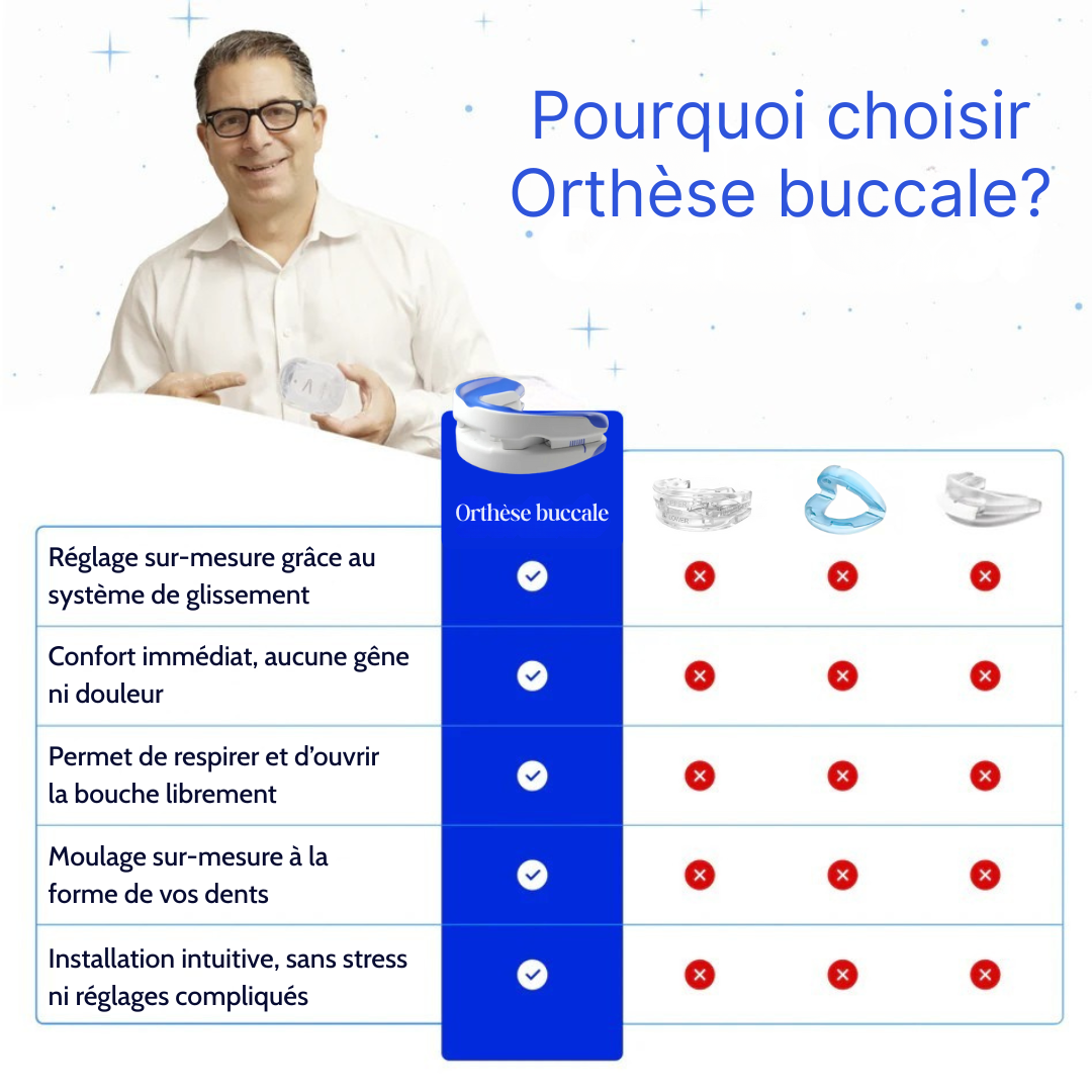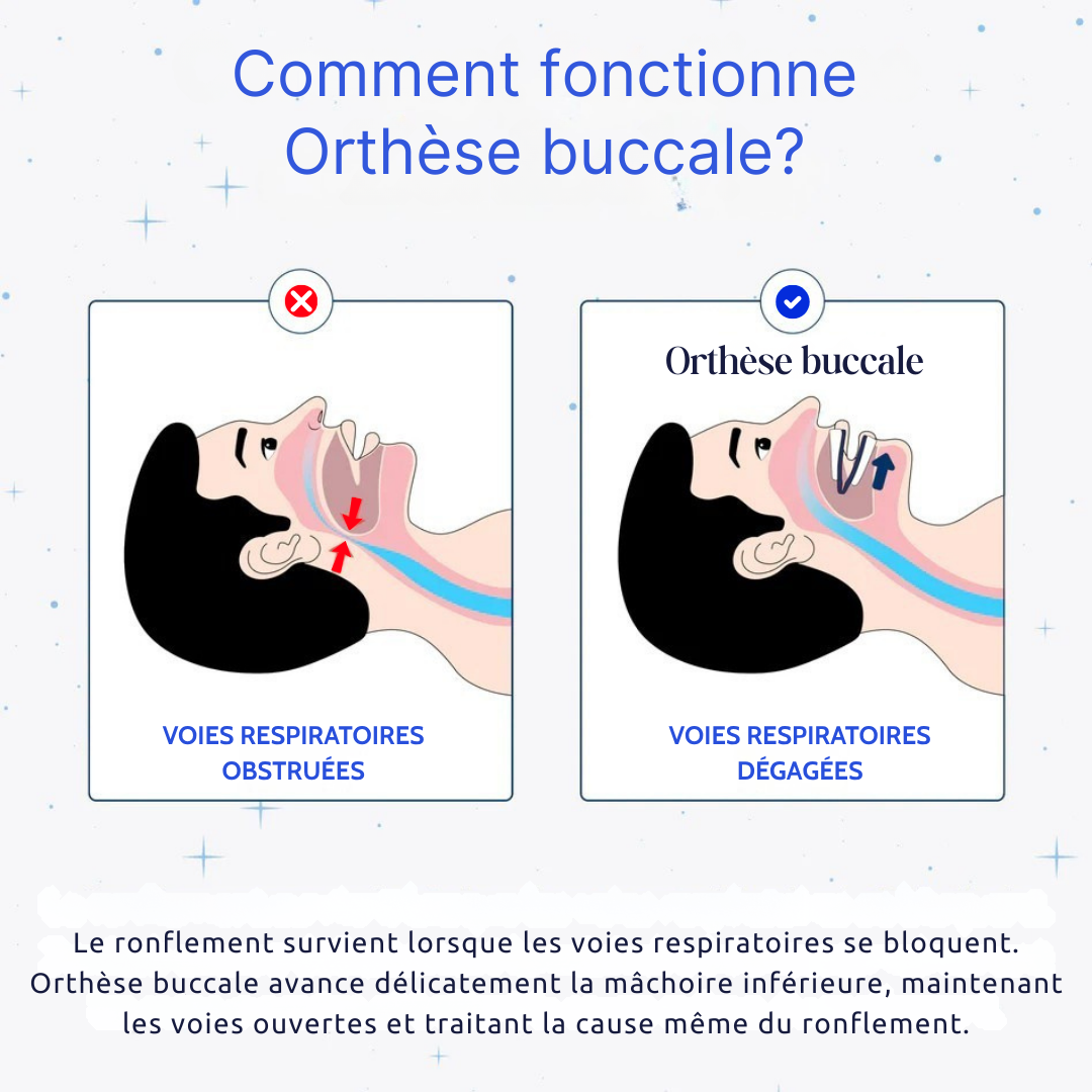 Diese Anti-Schnarch-Mundschiene wirkt direkt auf die Hauptursache des Schnarchens ein. Indem sie den Unterkiefer leicht nach vorne hält, fördert sie eine bessere Luftzirkulation während des Schlafs. Das Ergebnis: ruhigere Nächte und eine flüssigere Atmung, ohne sperrige Geräte oder komplizierte Installationen. Ihr ergonomisches Design ermöglicht eine komfortable Anwendung, auch über einen längeren Zeitraum.