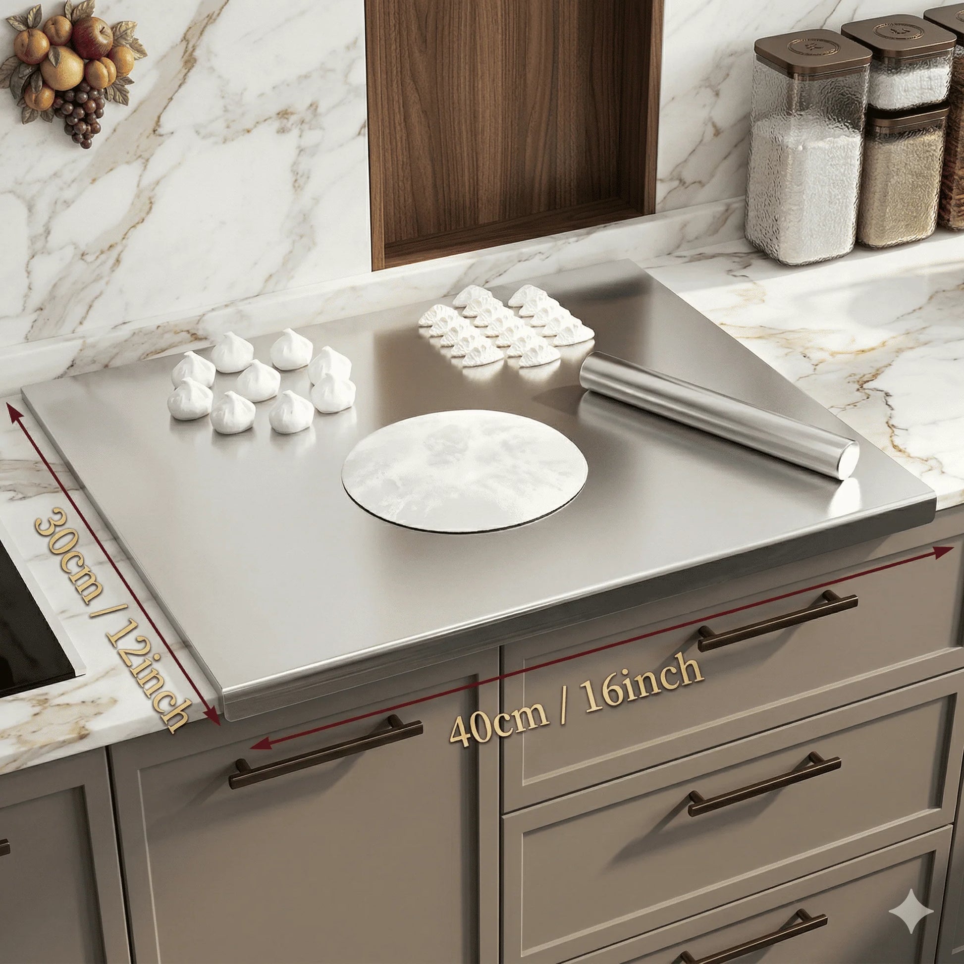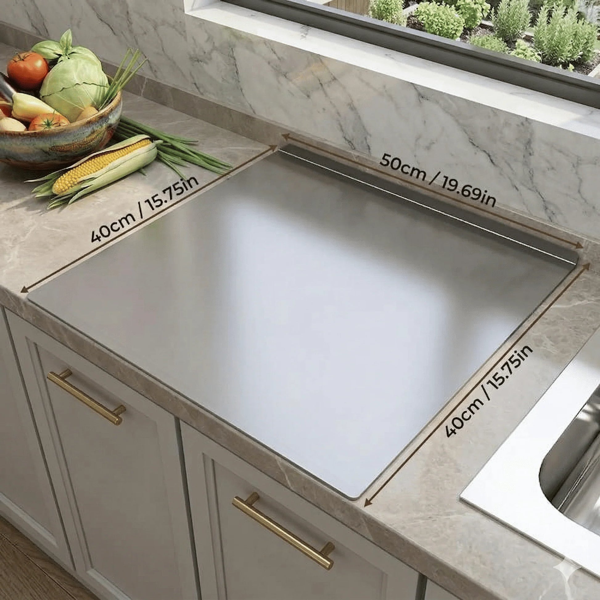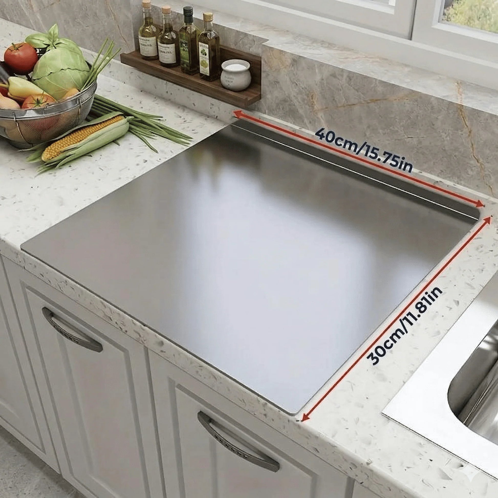 Der für dieses Schneidebrett verwendete Edelstahl nimmt weder Gerüche noch Bakterien auf und gewährleistet so ein hygienisches Schneideerlebnis. Es ist leicht zu reinigen und eignet sich ideal für den Einsatz in der Küche oder beim Backen.