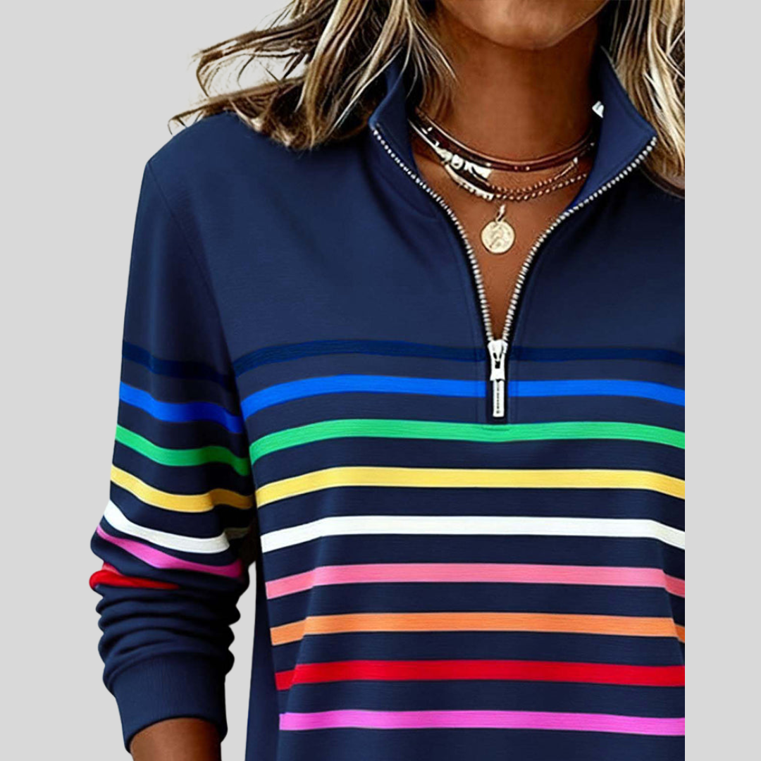 Das Design des Pullovers besticht durch farbenfrohe Streifen, die Ihrem Look Dynamik verleihen und gleichzeitig schlicht und elegant wirken. Der Pullover ist in mehreren Größen erhältlich und passt sich problemlos jeder Figur an. Er lässt sich leicht mit Jeans, Hosen oder sogar Röcken kombinieren und sorgt für einen frischen, zeitlosen Look. Der Reißverschluss am Kragen ermöglicht eine individuelle Anpassung und verleiht dem Pullover einen modernen Touch.