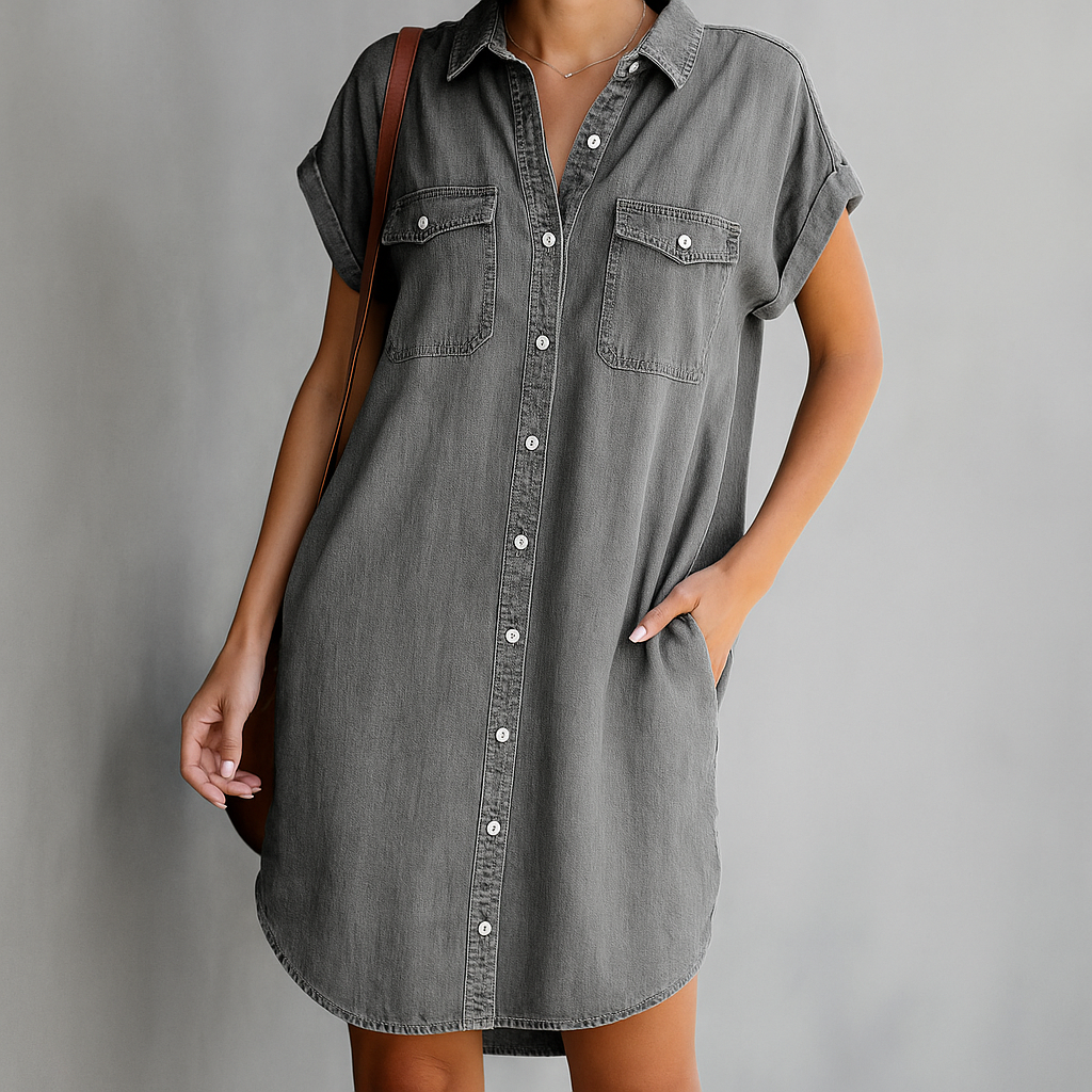 Dieses Hemdblusenkleid mit Knöpfen ist der perfekte Verbündete für entspannte Tage wie auch für spontane Ausflüge. Sein fließender, atmungsaktiver Stoff schmiegt sich an die Silhouette an, ohne abzuzeichnen, und bietet absoluten Komfort, während es gleichzeitig elegant aussieht. Der klassische Kragen, die krempelbaren Ärmel und die beiden Brusttaschen verleihen diesem vielseitigen Outfit einen subtilen Hauch von Charakter.