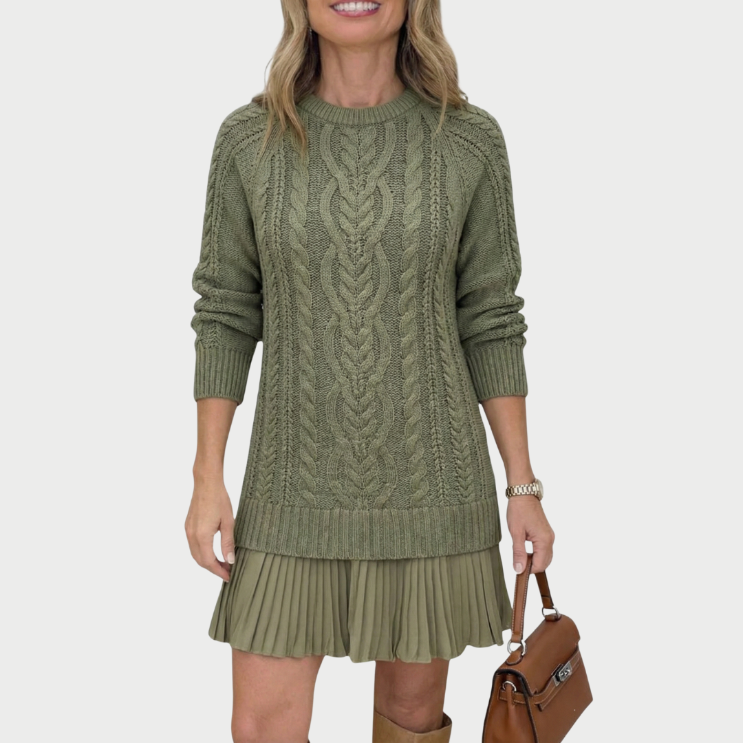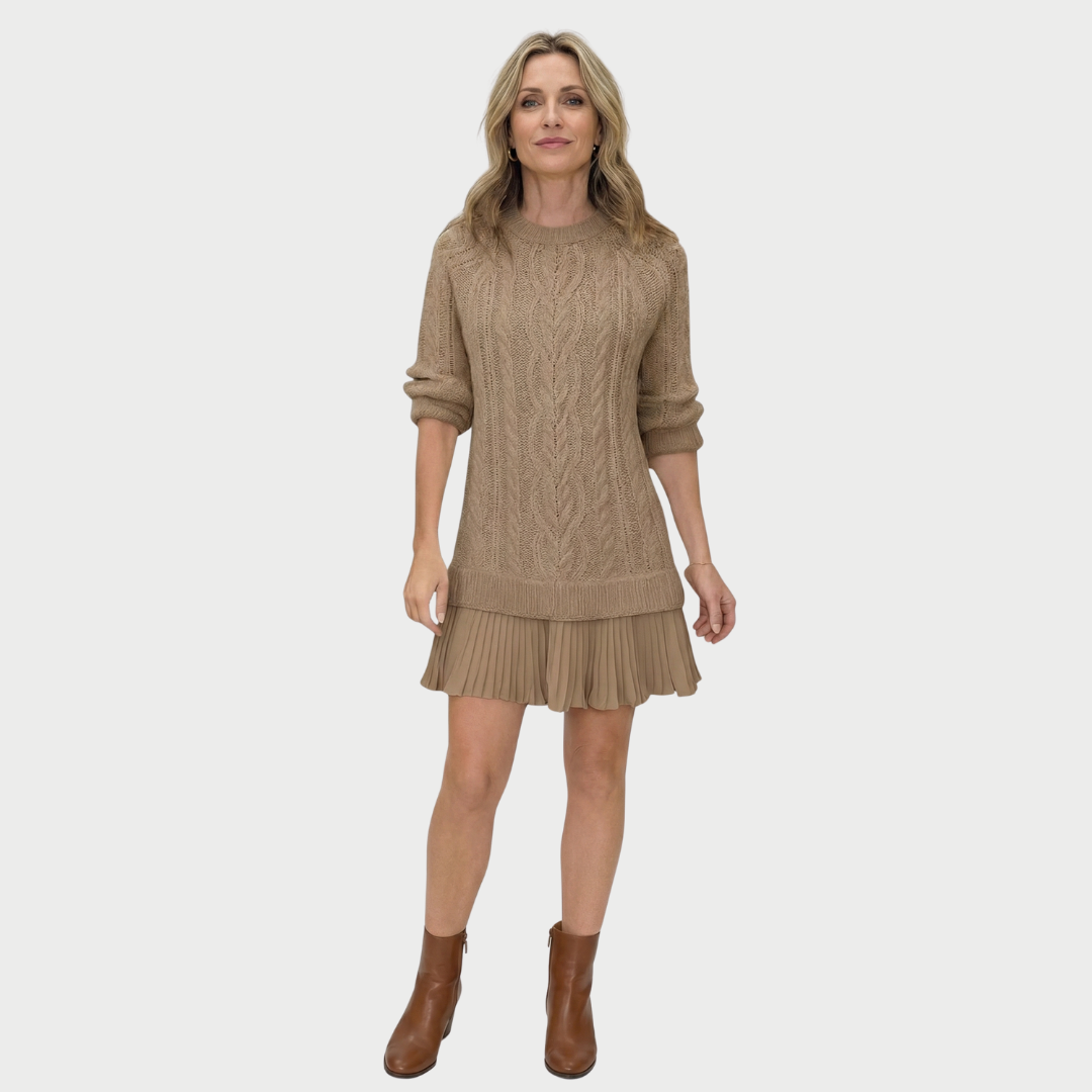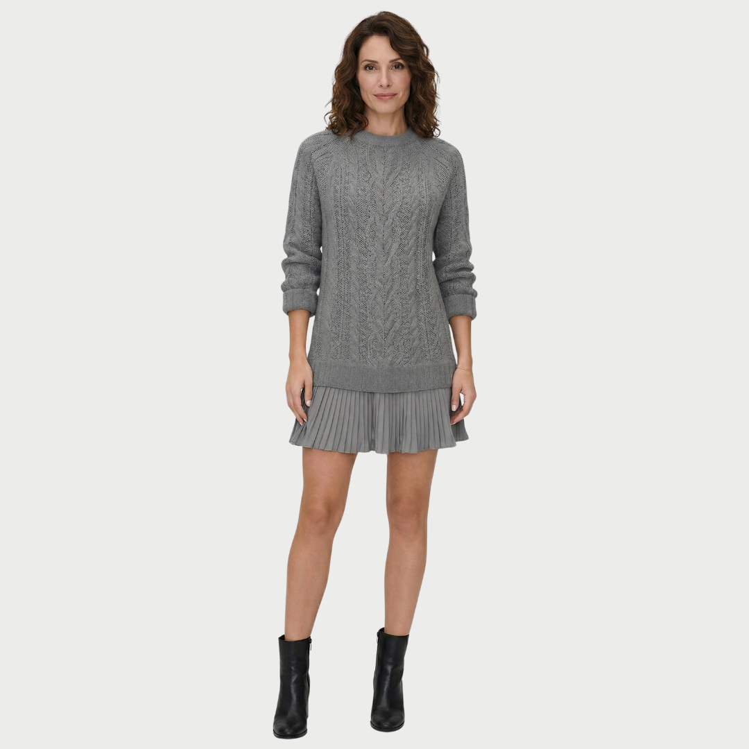 Dieses Strickkleid mit Zopfmuster sorgt auf den ersten Blick für einen eleganten und gepflegten Look. Sein gerader, leicht taillierter Schnitt betont die Silhouette, ohne einzuengen, während die Zopfmuster für Struktur und Charakter sorgen. Es lässt sich sowohl solo als auch mit Strumpfhosen tragen und passt sowohl zu einem Alltagsoutfit als auch zu einem eleganteren Look.