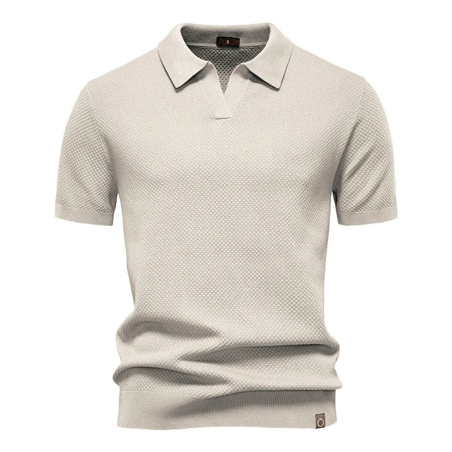 Der offene Polokragen ohne Knöpfe sorgt für einen modernen Touch. Die kurzen Ärmel und der dezente Glanz der Textur runden das Ensemble elegant ab. Zu Jeans, Chinos oder Shorts getragen, sorgt es für einen raffinierten Look in aller Einfachheit.