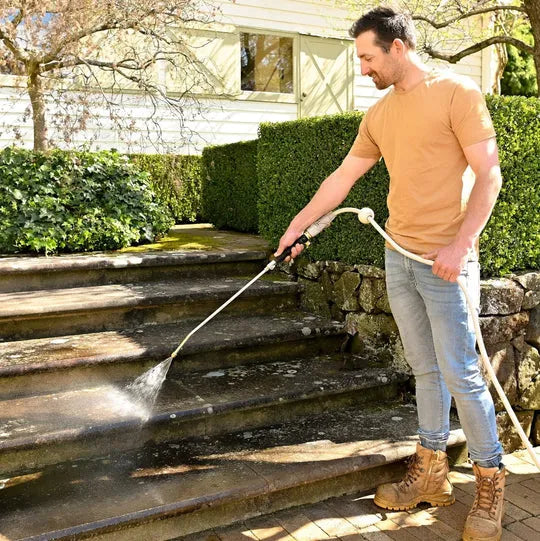 Diese Hochdruckdüse verwandelt jeden herkömmlichen Gartenschlauch in ein leistungsstarkes Reinigungswerkzeug. Dank ihrer intelligenten Designs mit zwei austauschbaren Düsen (Zylinder- und Fächerform) passt sie sich flexibel jeder Reinigungsaufgabe an - ob Terrasse, Auto, Fassade oder Gartenmöbel. Ganz ohne Strom, nur mit Wasserdruck!