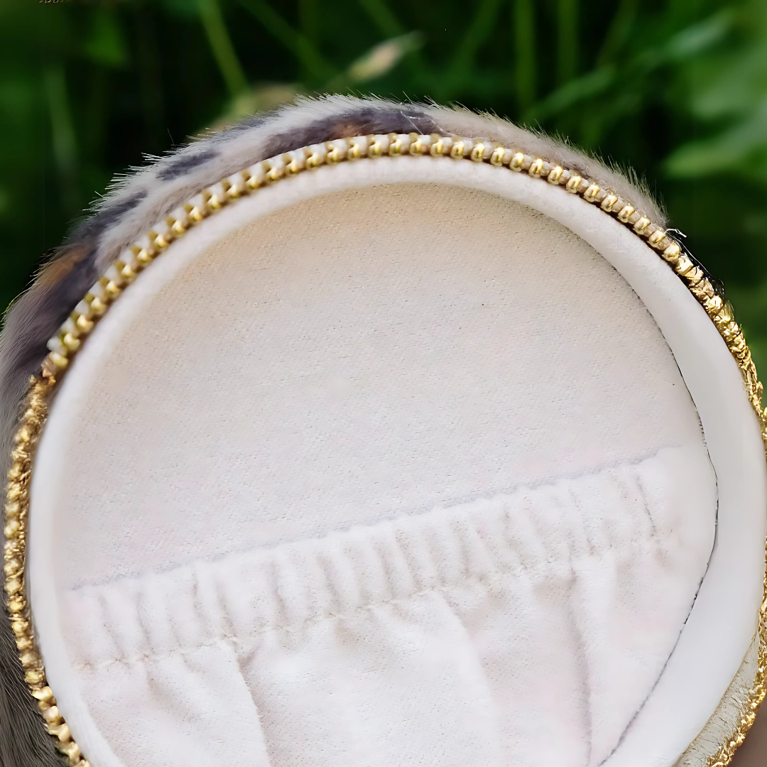 L'interno è foderato con un velluto chiaro, piacevole al tatto, che protegge i gioielli dai graffi. Ogni pezzo rimane al suo posto grazie alle ingegnose tacche. È un modo elegante per portare con cura i vostri accessori, anche durante un breve viaggio.