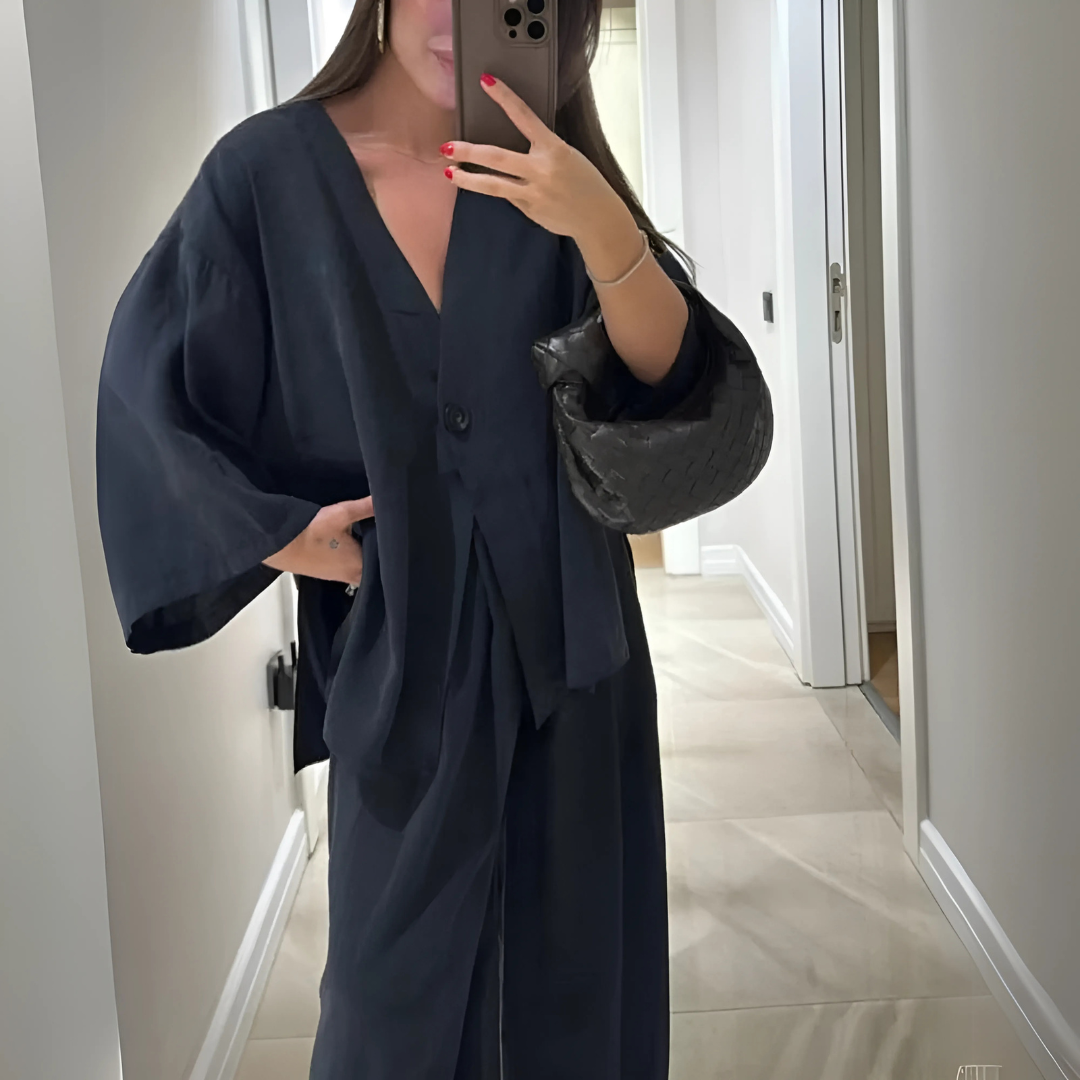Questo set casual con scollo a V combina un design elegante con una grande raffinatezza. Il sottile scollatura garantisce un'ottima libertà di movimento e offre un'ampia gamma di accessori. L'inserto a V in alto sottolinea la silhouette e conferisce all'outfit una nota moderna.