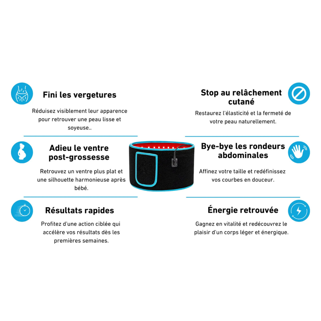 Questa cintura a luce rossa utilizza una tecnologia innovativa per colpire le aree sensibili del corpo. Il suo calore delicato e i suoi raggi luminosi favoriscono il rilassamento muscolare e stimolano il recupero dopo l'esercizio fisico. È adatta sia per il mal di schiena che per le tensioni addominali, per un'immediata sensazione di comfort.