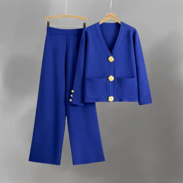 Il set CELESTE incarna il perfetto equilibrio tra raffinatezza e benessere. Realizzato in una maglia morbida e fluida, è leggero e caldo, ideale per tutte le stagioni. Il cardigan aderente con dettagli sofisticati e i pantaloni fluidi garantiscono una silhouette elegante senza compromettere il comfort.