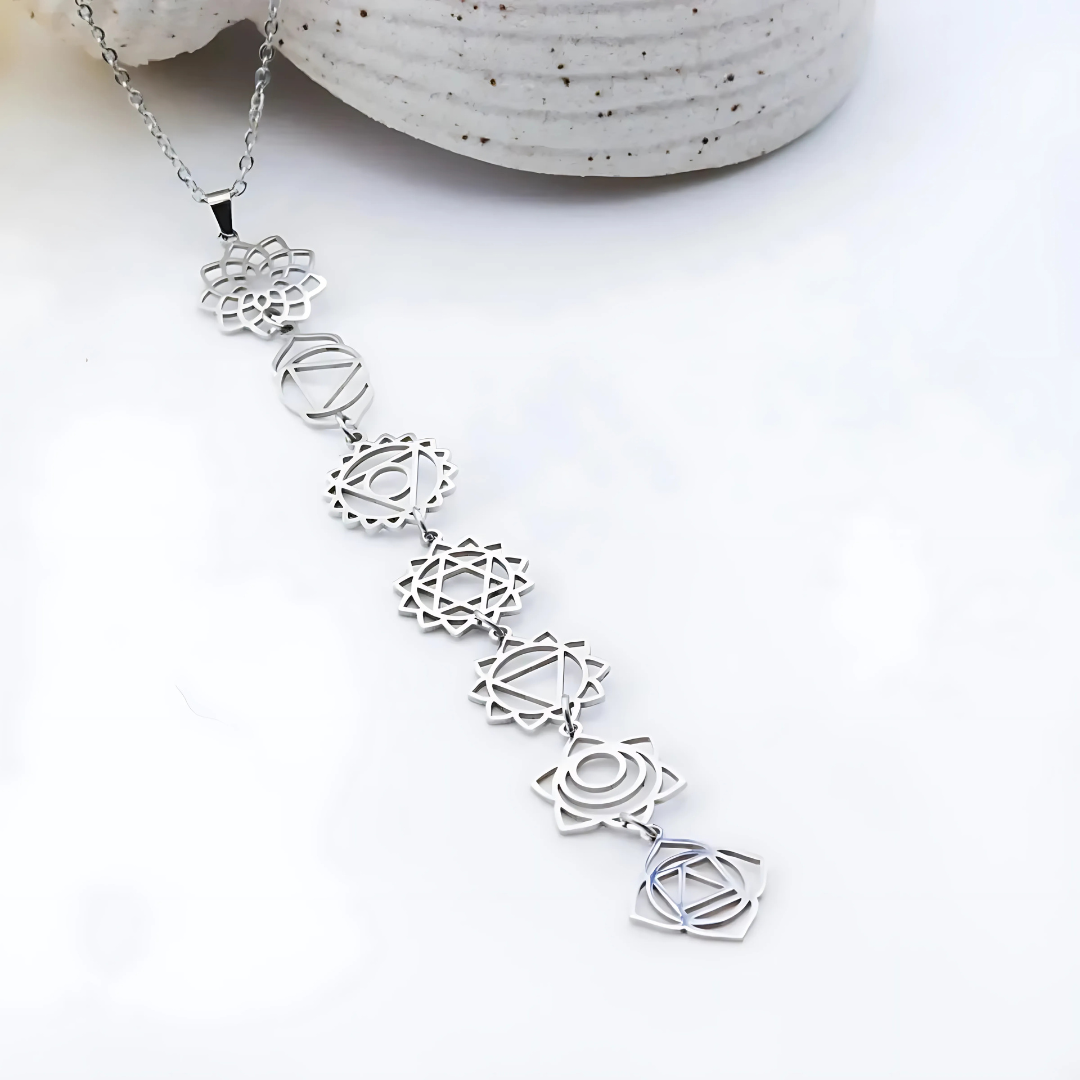 Date alla vostra vita quotidiana un profondo senso di equilibrio con questa collana che rappresenta i 7 chakra essenziali. Ogni simbolo inciso è un invito a coltivare l'armonia tra corpo, mente ed emozioni.