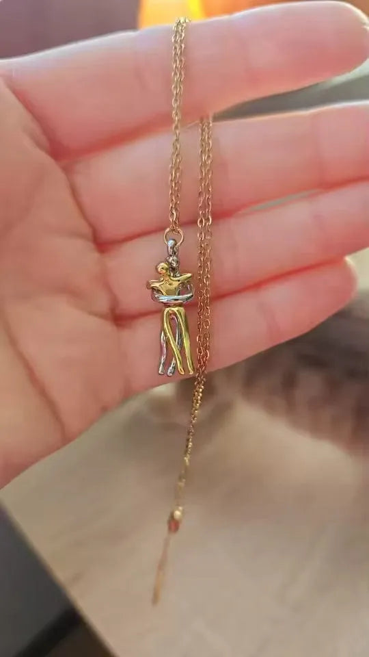 Questa collana rappresenta l'unione sincera tra due anime. Il suo design raffinato cattura il momento di un dolce abbraccio. L'oro delicatamente lucidato riflette la luce con eleganza, aggiungendo un tocco prezioso a ogni outfit, sia esso quotidiano o elegante.