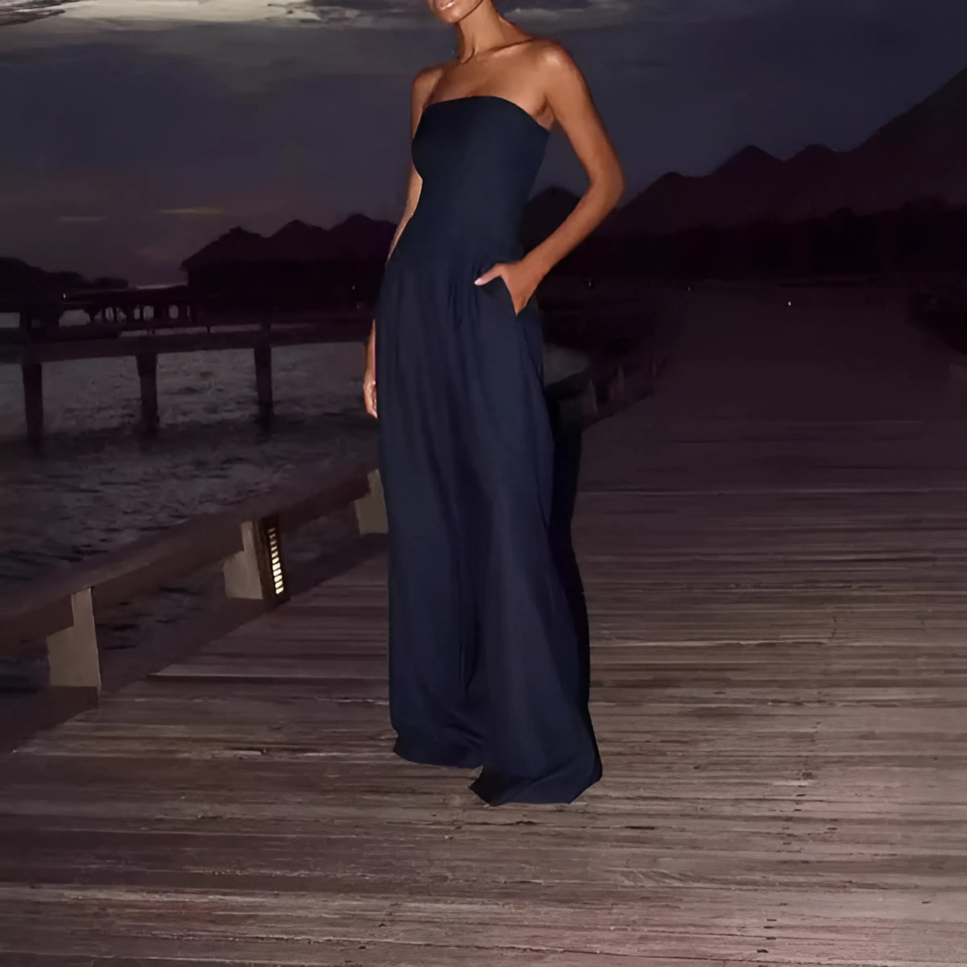 Questa tuta senza spalline è un must per chi cerca un look sofisticato ma senza sforzo. Il taglio fluido è perfetto per qualsiasi figura, mentre il tessuto morbido offre un'impareggiabile libertà di movimento. Ideale per le serate estive, le cene con gli amici o anche per un look casual chic durante il giorno.