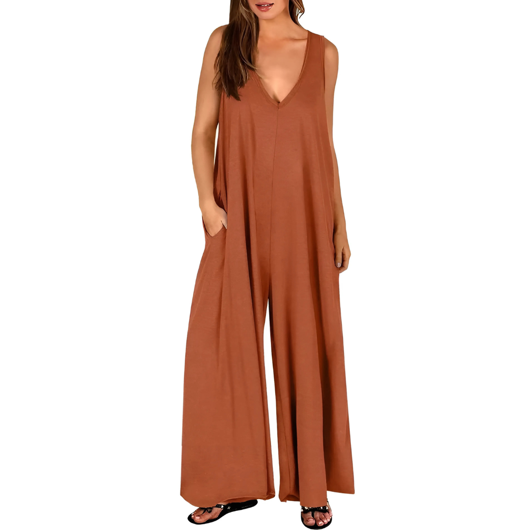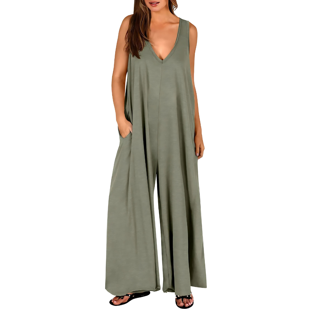 Con la sua vestibilità ampia e il profondo scollo a V, questa tuta offre un look moderno e senza sforzo. Offre una totale libertà di movimento e valorizza la figura in modo naturale.