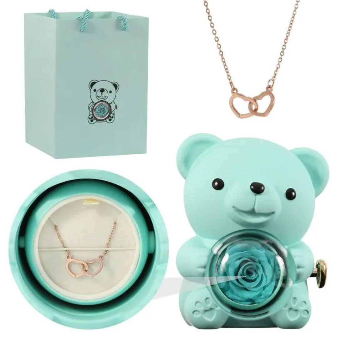 Astuccio per orso rosso e collana personalizzata con rosa eterna