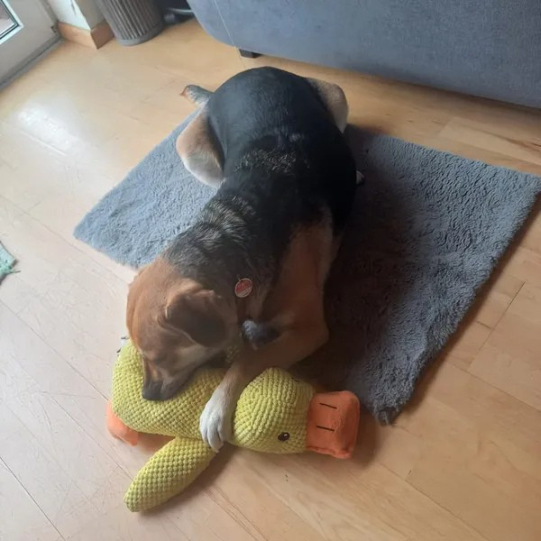 Il mio cane adora la sua anatra, dorme e gioca sempre con lei.