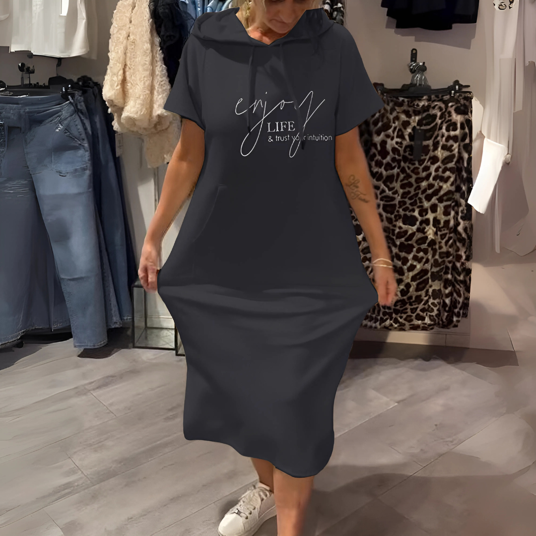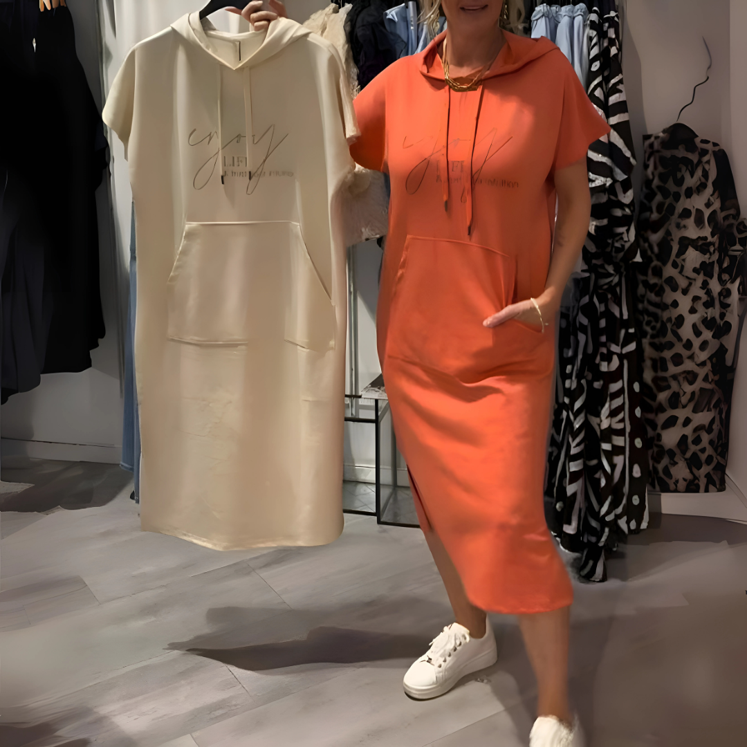 Questo Kapuzenkleid è caratterizzato da comfort ed eleganza moderna. La struttura allungata garantisce la massima libertà di movimento, mentre l'aspetto della giacca conferisce un tocco sportivo. Ideale per Spaziergänge, Einkäufe o per lunghi soggiorni a casa.