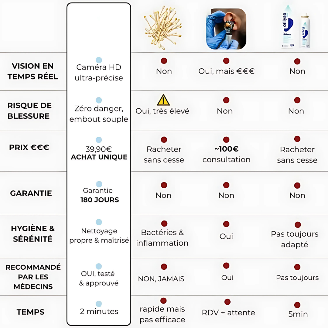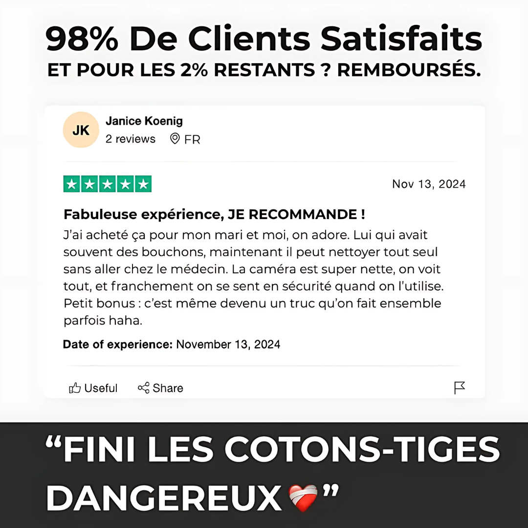 Niente più cotton fioc inefficaci. La fotocamera consente di rimuovere il cerume visibile e di sentirsi puliti fin dal primo utilizzo. Pulizia, prevenzione e precisione, tutto senza una visita medica.