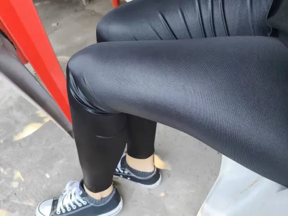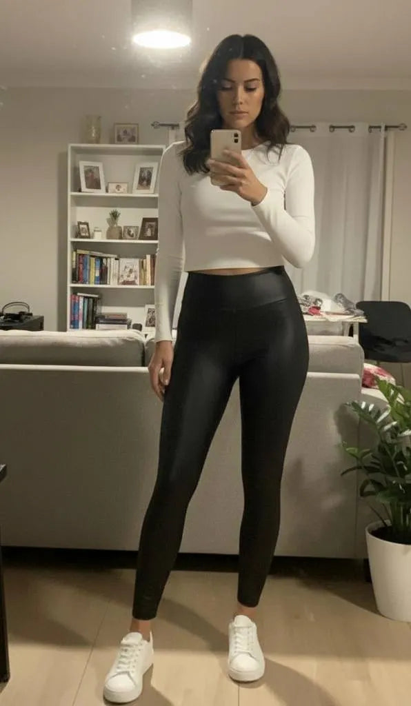 Questi leggings effetto pelle valorizzano la figura offrendo una totale libertà di movimento. La vita alta sostiene i muscoli addominali e snellisce visibilmente il punto vita. Il tessuto morbido ed elastico abbraccia ogni curva senza comprimere, per un look elegante e femminile in ogni circostanza.