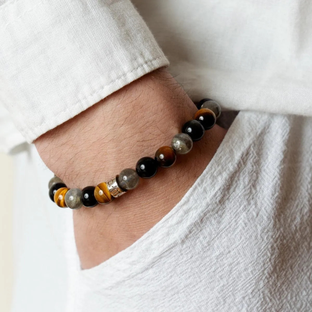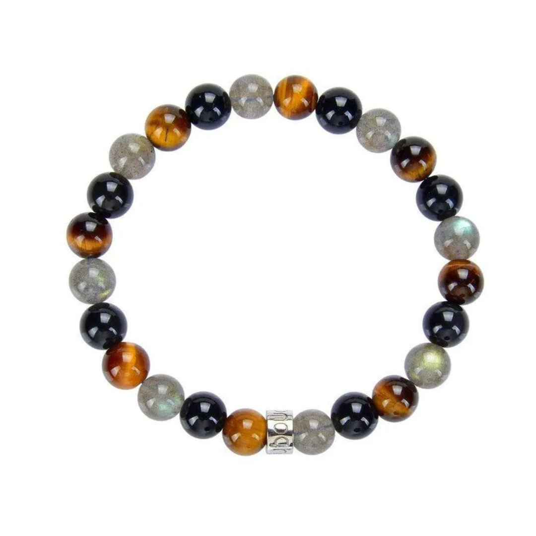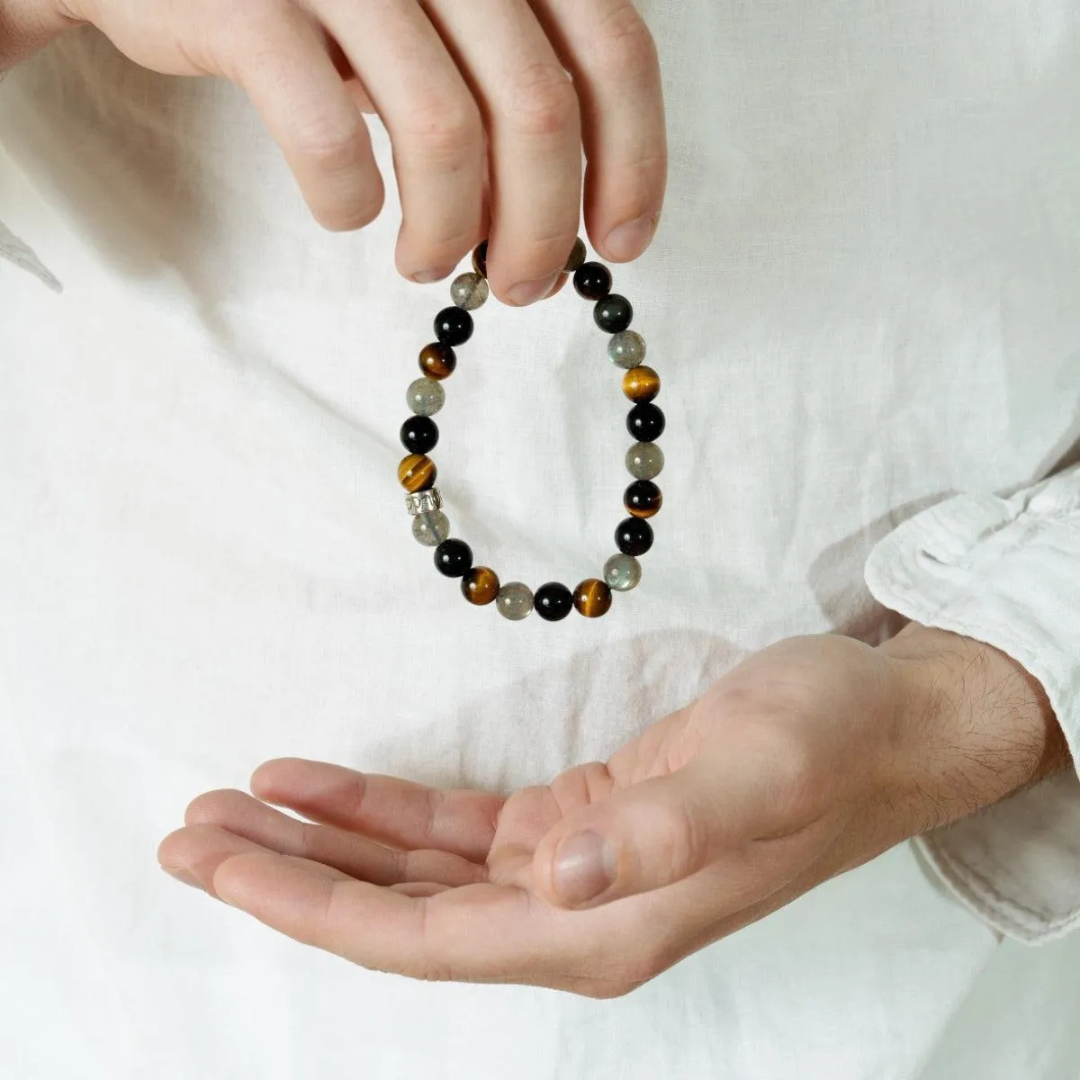 Ce bracelet associe trois pierres naturelles reconnues pour leur puissance énergétique. La labradorite apaise le mental et renforce la confiance. L’obsidienne noire agit comme un bouclier protecteur contre les énergies négatives. Quant à l’œil de tigre, il dynamise la motivation et favorise la clarté d’esprit. Ensemble, elles créent une synergie parfaite entre force intérieure et calme émotionnel.