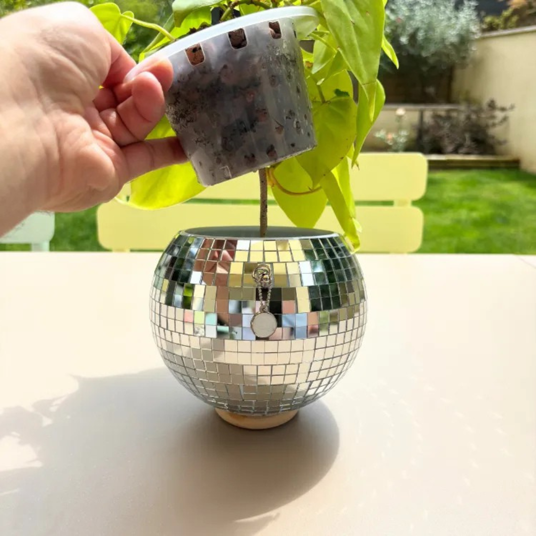 Ce cache-pot brillant transforme instantanément votre intérieur en un espace vibrant et tendance. Avec sa surface réfléchissante façon boule disco, il capte la lumière naturelle et diffuse un éclat scintillant sur vos murs, créant une ambiance joyeuse et moderne.
