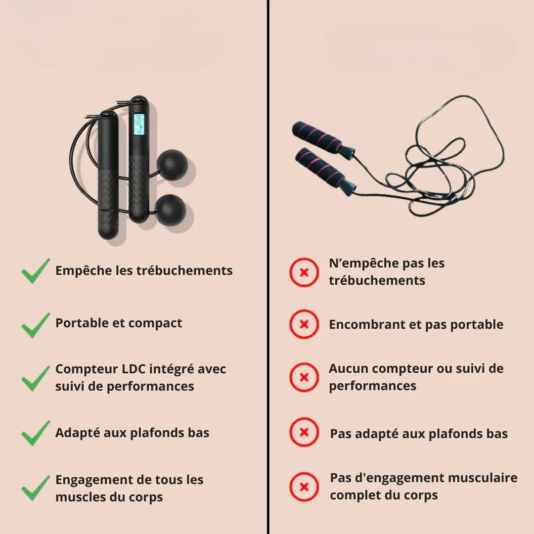 Fini les interruptions ! Grâce à son système de roulement fluide, chaque saut est optimisé pour un effort continu. Les boules lestées vous aident à garder le rythme sans forcer. Légère, transportable, elle vous accompagne partout pour rester actif au quotidien. Et en bonus : un programme minceur pour booster votre motivation et vos résultats.