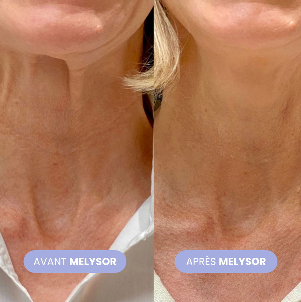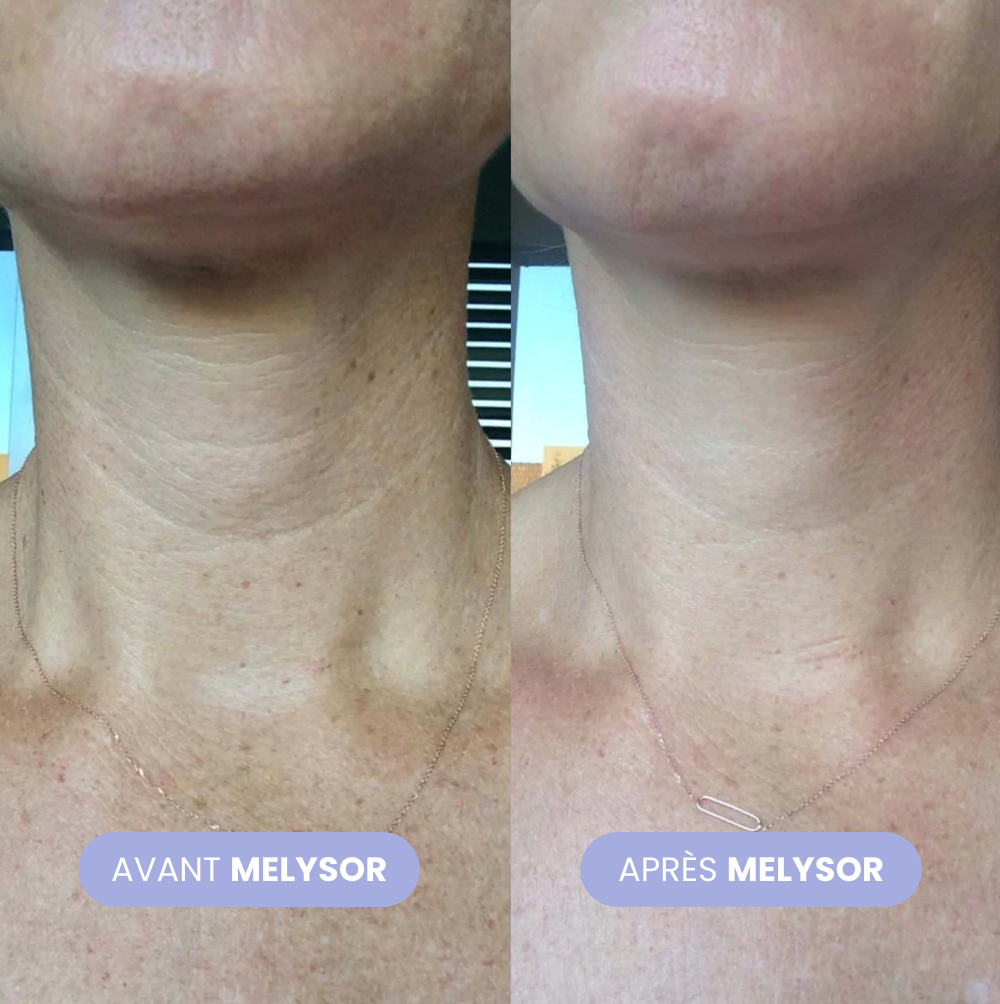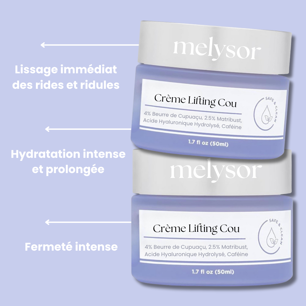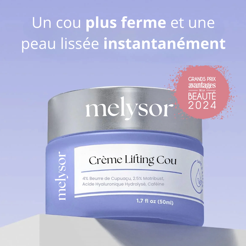 La Crème Lifting Cou de Melysor est spécialement formulée pour raffermir et lisser la peau fragile du cou. Enrichie en beurre de Cupuaçu (4 %) et en Matribust (2,5 %), elle stimule l’élasticité cutanée et atténue les signes visibles du vieillissement. Son action hydratante intense nourrit la peau en profondeur, réduisant l’apparence des rides et du relâchement dès les premières applications.
