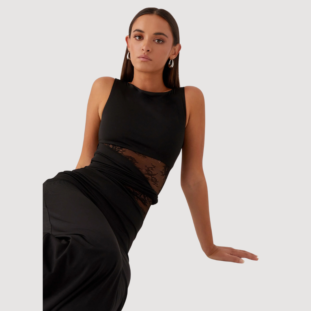 Dieses lange Kleid vereint Stil und Raffinesse in einer klaren Silhouette. Der figurbetonte Schnitt betont die Taille und zaubert eine elegante, selbstbewusste Ausstrahlung. Das dezente Spiel aus Stoff und Cutouts verleiht dem Design einen modernen, femininen Touch – perfekt für Galaabende, Feiern oder elegante Dinner.