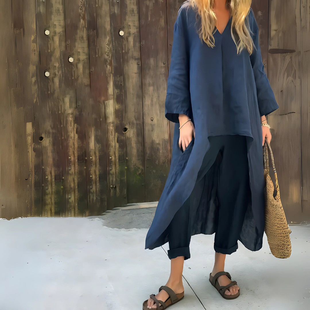 Confectionné dans un mélange de lin et de coton, l’ensemble garantit respirabilité et douceur sur la peau. Les fibres naturelles absorbent l’humidité, limitent les plis et facilitent l’entretien : un simple lavage à froid suffit pour préserver la teinte et la tenue du tissu.