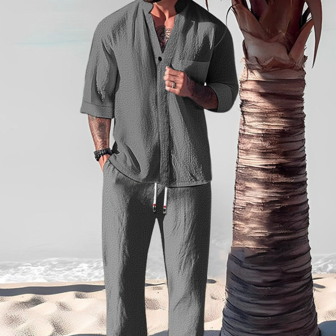 Pensé pour les journées d’été, cet ensemble deux pièces pour homme conjugue légèreté et allure. Composé d’une chemise à col classique et d’un pantalon assorti, il offre une silhouette soignée sans compromettre le confort. Sa coupe droite et fluide s’adapte à toutes les morphologies pour un porté naturellement chic.