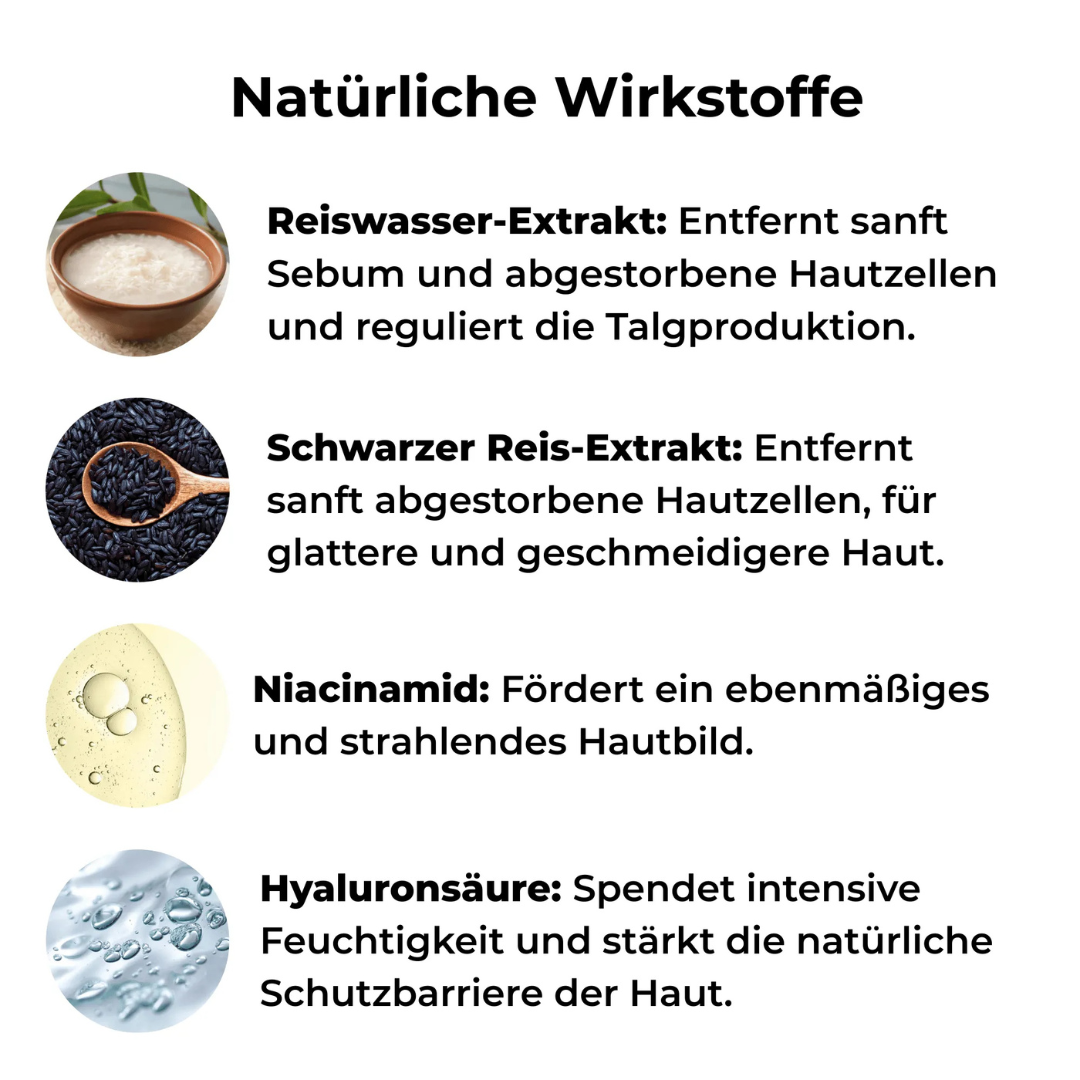 Die innovative Kombination aus Reisextrakt, Niacinamid und Hyaluronsäure wurde von Hautexperten entwickelt, um die Hautregeneration zu fördern und Unreinheiten zu mildern. Bei regelmäßiger Anwendung werden Poren verfeinert und die Hautstruktur sichtbar verbessert.