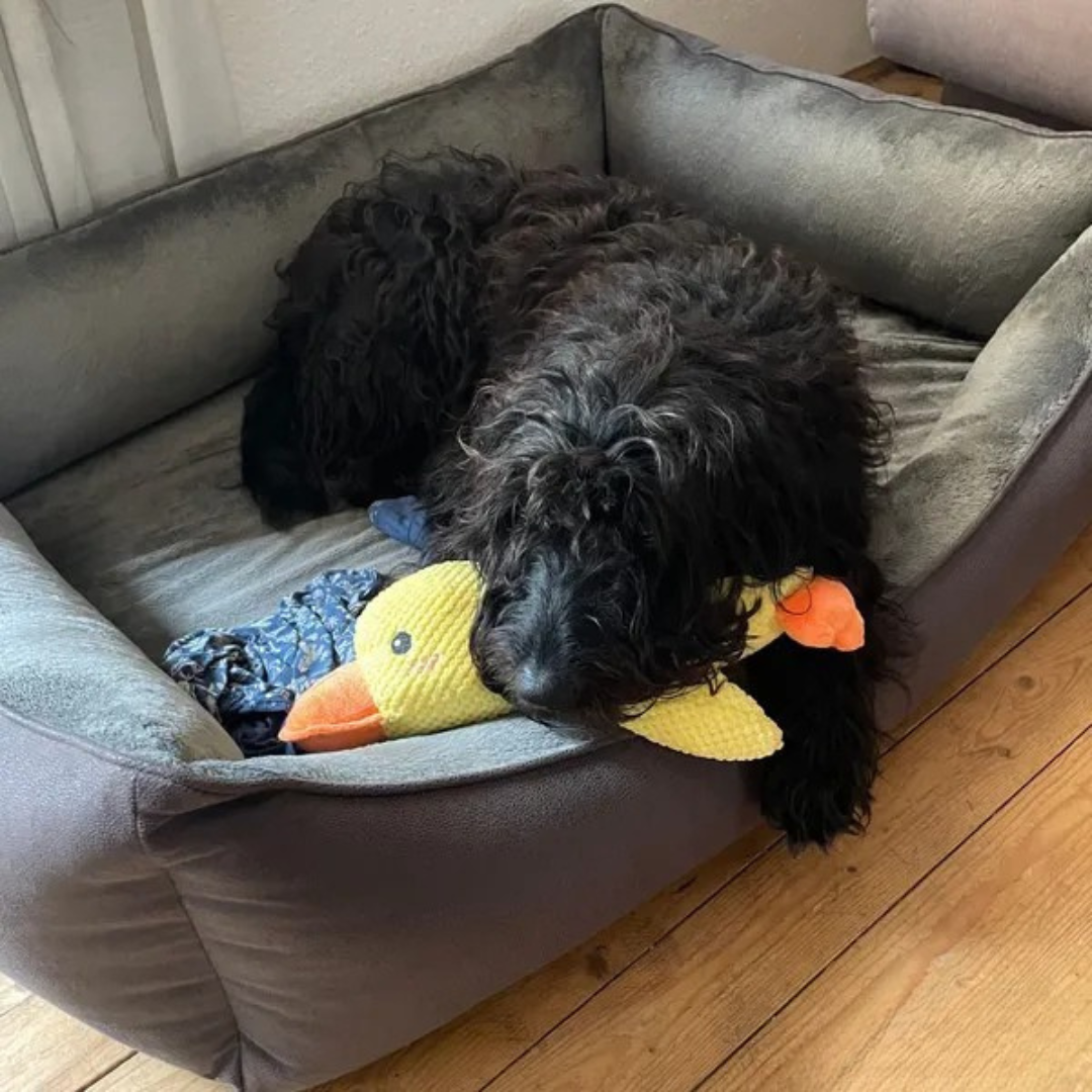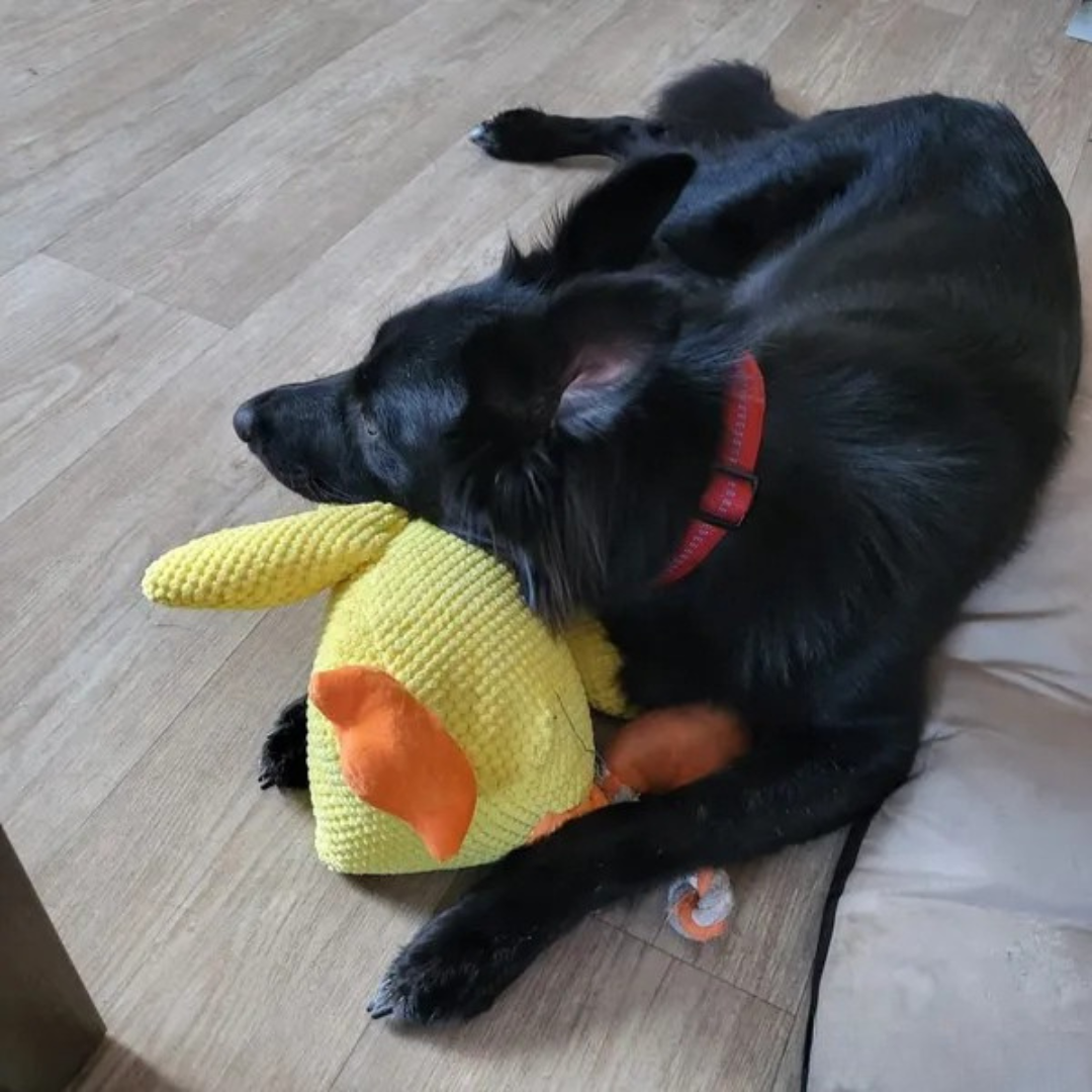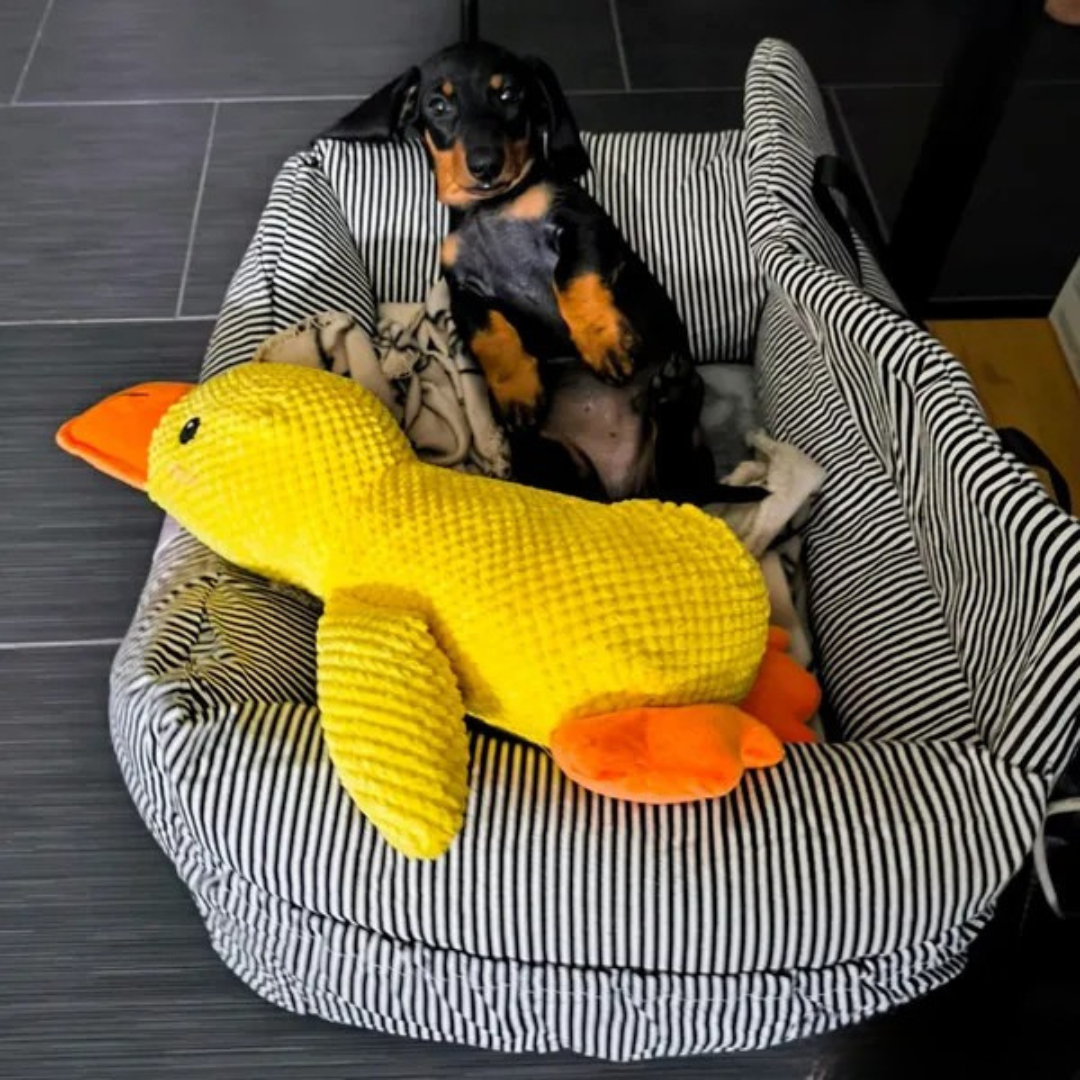 Mon chien adore son canard, il dort et joue avec tout le temps.