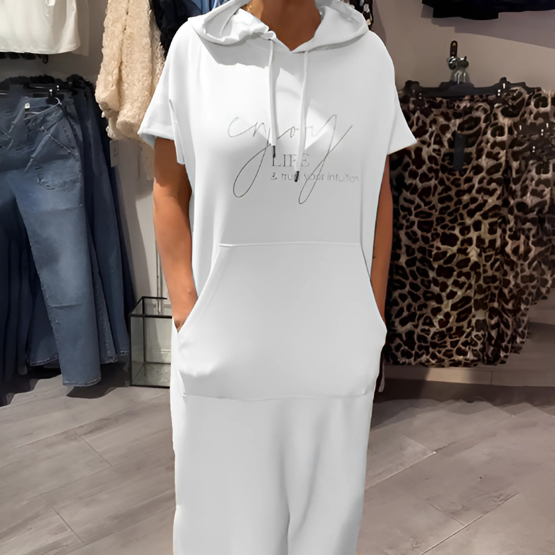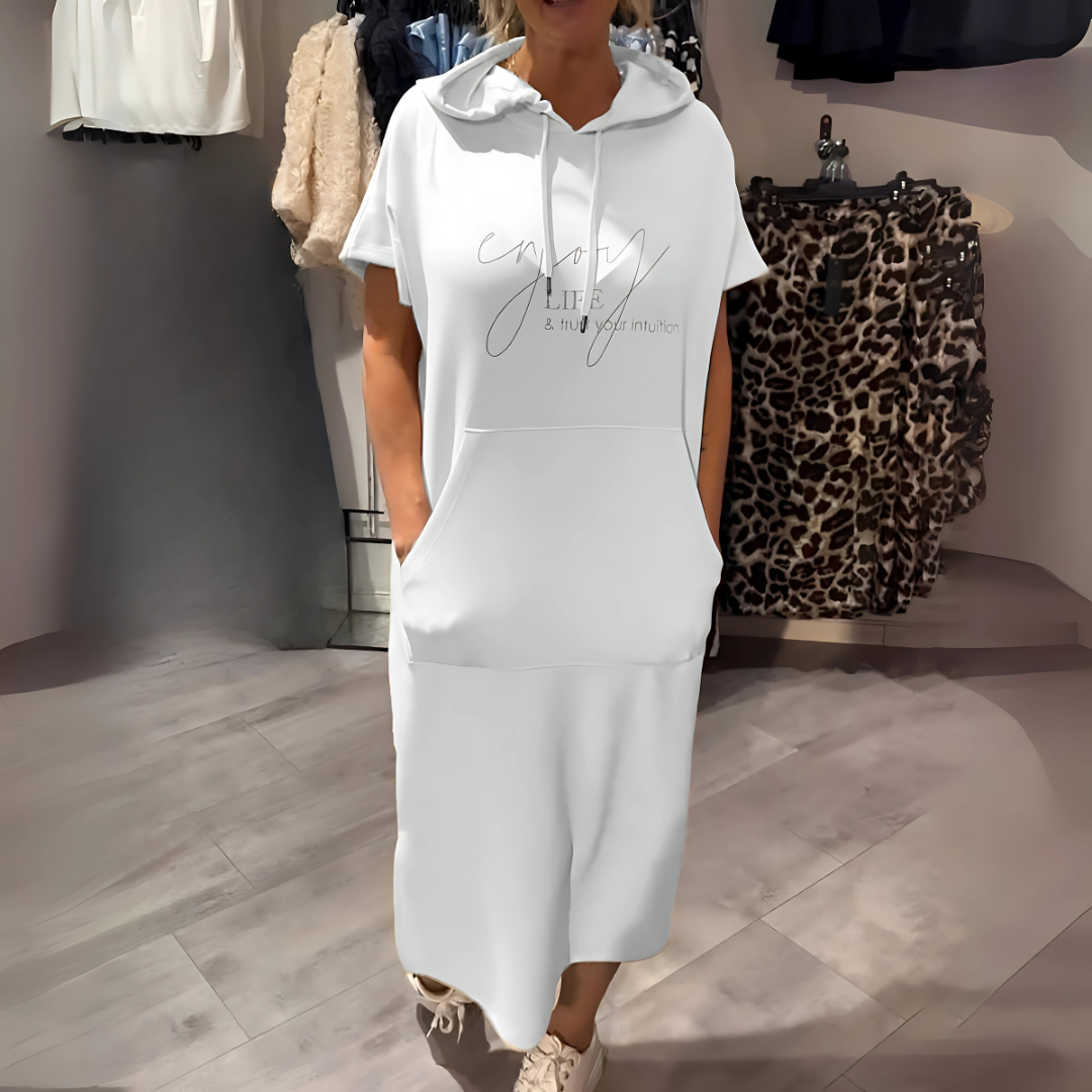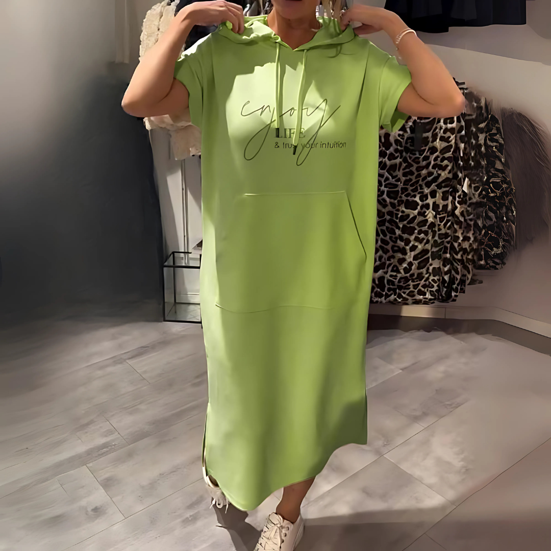 Dieses lockere Kapuzenkleid vereint Komfort und moderne Eleganz. Der entspannte Schnitt sorgt für maximale Bewegungsfreiheit, während die Kapuze dem Look einen sportlichen Touch verleiht. Ideal für Spaziergänge, Einkäufe oder entspannte Tage zu Hause.