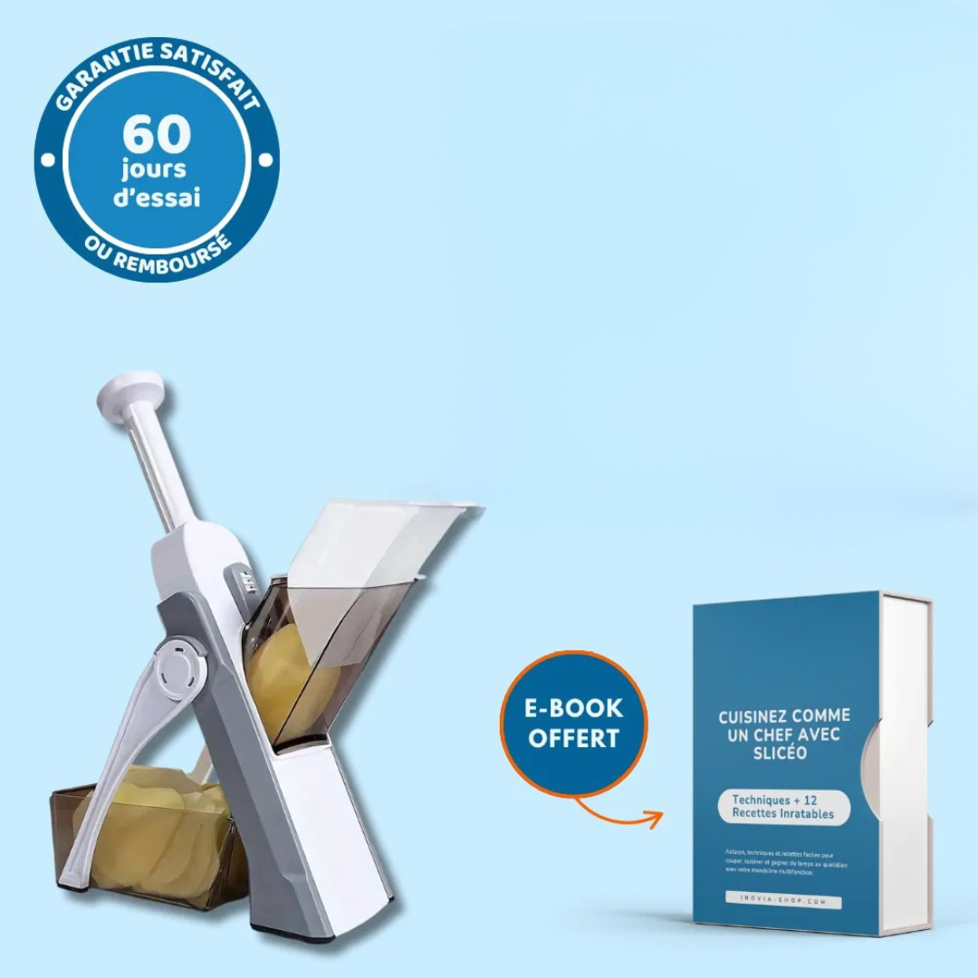 Le poussoir de protection garde vos doigts à l’abri tout en offrant une prise ferme. L’inclinaison idéale du plan de coupe assure un travail fluide, rapide et sans fatigue. Parfaite pour les frites, concombres, carottes, oignons ou fromages.