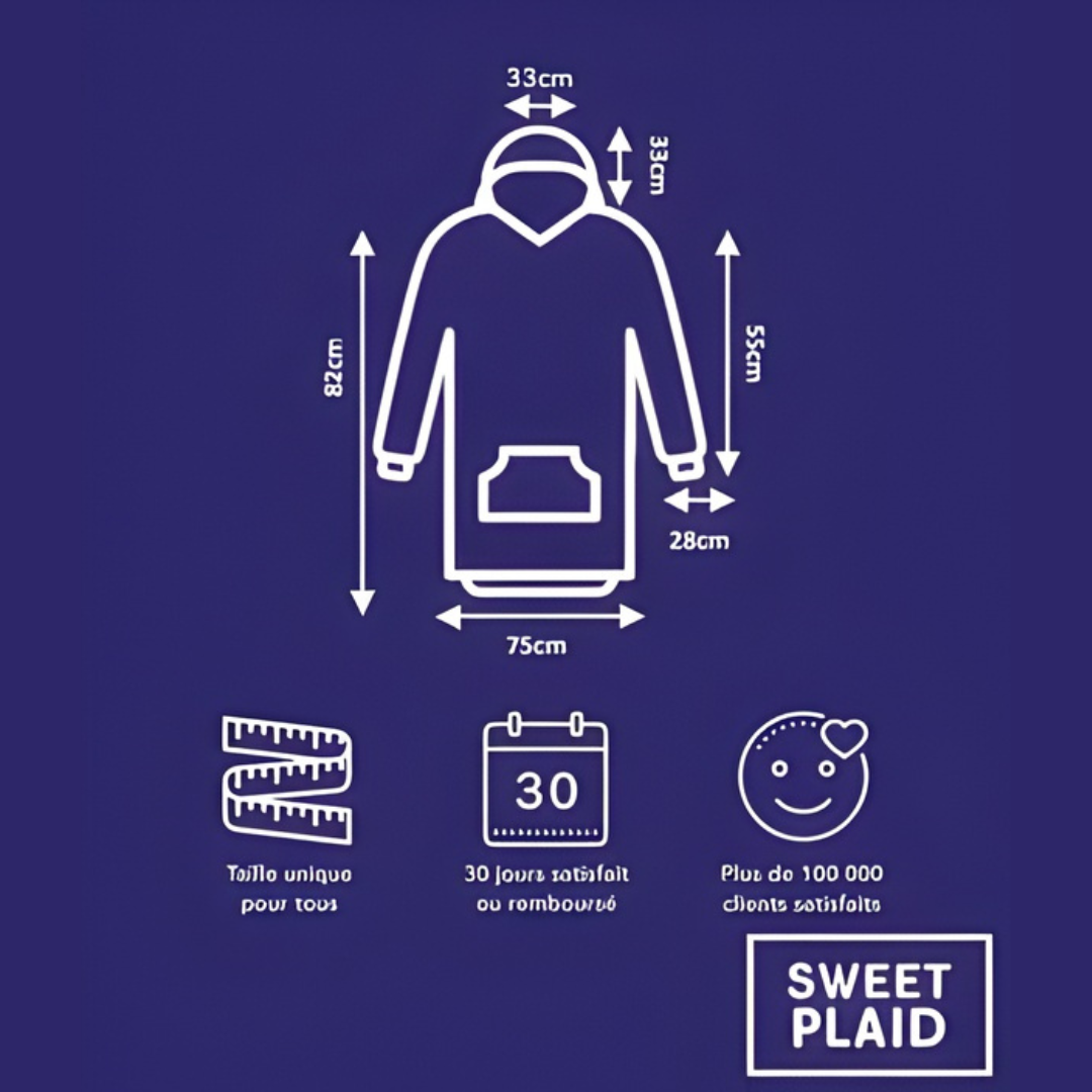 Grâce à sa coupe ample et sa taille unique, ce plaid s’adapte à toutes les morphologies. Les grandes manches permettent de bouger librement, tandis que la grande poche ventrale garde vos mains bien au chaud ou accueille votre téléphone et vos petits accessoires.